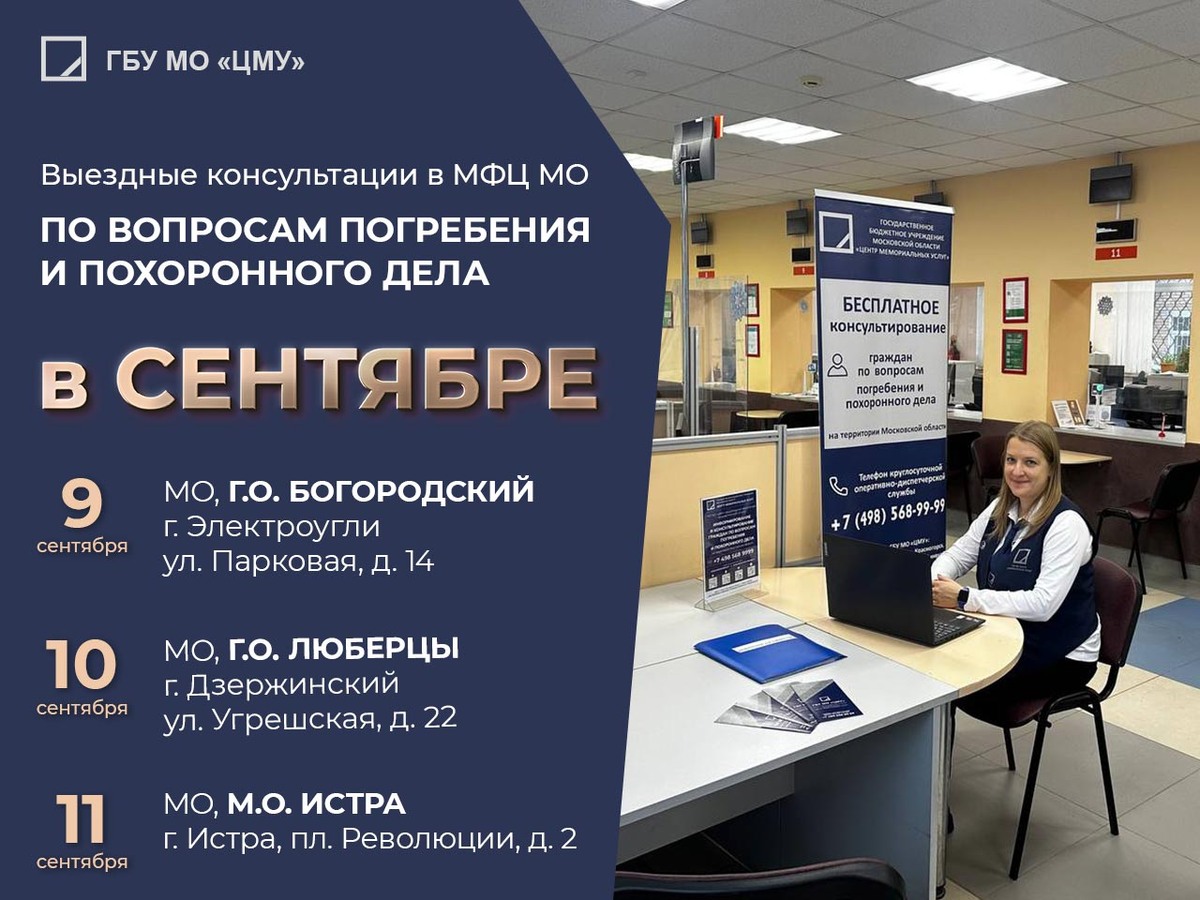 Бесплатные консультации от специалистов ГБУ МО «Центр мемориальных услуг» по вопросам погребения и похоронного дела в МФЦ вашего города. Спешите получить консультацию в МФЦ вашего города, согласно графику выездов, от специалистов ГБУ МО «Центр мемориальных услуг». Если вы хотите узнать о законодательстве в сфере погребения и похоронного дела - приходите в МФЦ на консультацию. Наши специалисты ответят на все интересующие вас вопросы. Запланированные выезды: 09.09.2025 МФЦ, Московская обл., г.о. Богородский, г. Электроугли, ул. Парковая, д. 14 10.09.2025 МФЦ, Московская обл., г.о. Люберцы, г. Дзержинский, ул. Угрешская, д.22 11.09.2025 МФЦ, Московская обл., м.о. Истра, г. Истра, пл. Революции, д. 2 Также получить бесплатную консультацию в сфере погребения и похоронного дела можно удаленно, обратившись на круглосуточную горячую линию