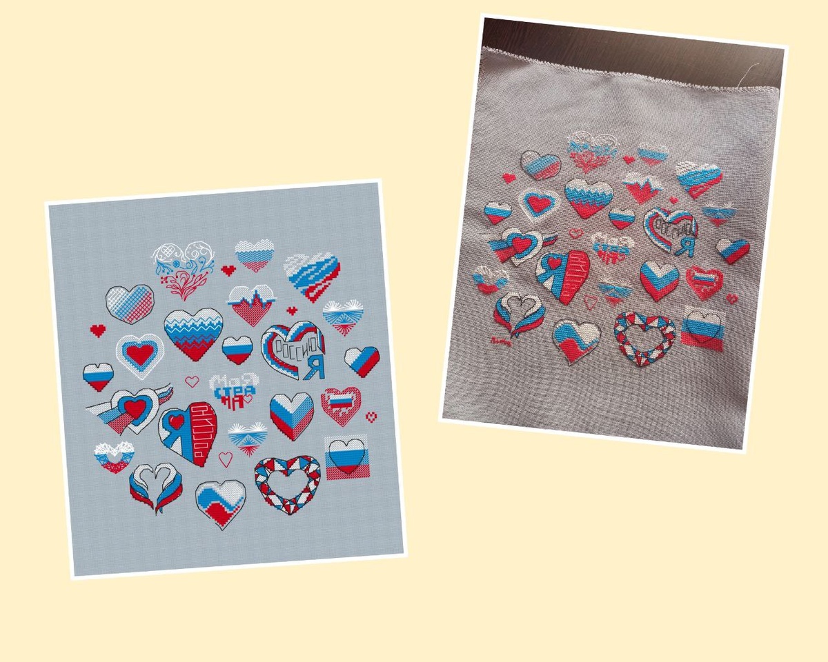 Всем привет!!! Меня зовут Наташа, и я с огромным удовольствием занимаюсь вышивкой. Рада представить вашему вниманию мой дневник вышивальщицы. Вышивка крестом — одно из самых увлекательных направлений рукоделия. Она позволяет создавать уникальные произведения искусства своими руками. Этот процесс требует терпения, внимательности к деталям и творческого взгляда. Я занимаюсь вышивкой уже много лет, но только в этом году решила составить планы для своих работ. В процессе я неожиданно поняла, что моя страсть к вышивке меняется в зависимости от сезона. Кроме того, я люблю создавать вышивки, приуроченные к праздникам: Новый год, Пасха, День России, День знаний. Просматривая ленту соцсети, я наткнулась на схему «Сердца России». Почему бы не начать вышивать этот символичный проект летом, 12 июня? Я сразу же добавила его в планы на сезон. После выбора дизайна я начала подбирать материалы. Основу взяла турецкую равномерку 27 каунта. Нитки СХС, четыре оттенка: 310, 666, 3843 и BLANC. Все матери