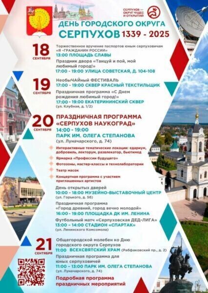 Обнародовала программа празднования Дня города Серпухов 686 лет Серпухову. Расписание : 19 сентября -Фестиваль c 17:00 — 19:00 сквер Красный Текстильщик. -Праздничная программа «С Днем рождения любимый город!» с 17:00 — 19:00 Екатерининский сквер, ул. Клубная, д. 1/2. 20 сентября -Праздничная программа «Серпухов наш град» с 14:00 — 19:00 парк имени Олега Степанова, ул. Лунчарского, д. 74. -Праздничная программа «Город древний, город вечный, город вечно молодой» с 16:00 — 19:00 площадь д/к имени Ленина. -Футбольный матч «Серпуховская ДЕНЬ-ЛИГА» с 13:00 — 14:00 стадион «Спартак», ул. Ленинского Комсомола.* Концертная программа с участием приглашенных артистов 21 сентября -Общегородской молебен ко Дню городского округа Серпухов 11:00 Всехсвятский храм, Рабфаковский пр., д. 2. -Детская праздничная программа с 11:00 — 13:00 парк имени Олега Степанова, ул. Луначарского, д. 74.