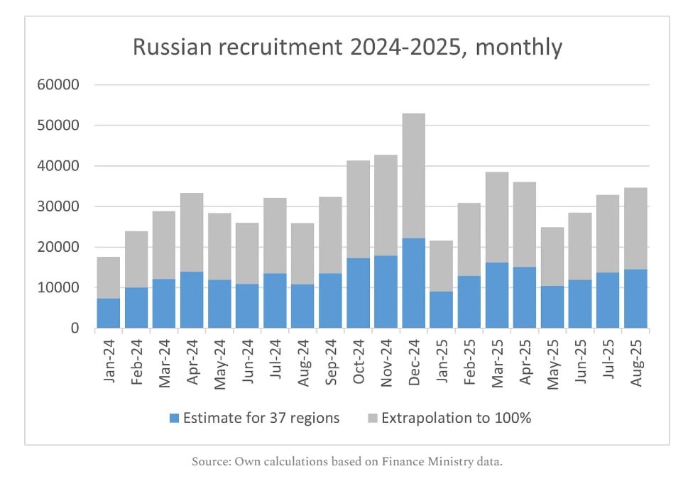 В конце 2024 года я прогнозировал, что у ВС РФ примерно с лета этого года начнутся проблемы с набором новых контрактников и постепенно начнёт расти риск мобилизации, достигнув критической отметки в районе осени, после завершения условного «летного наступления». Теперь имея актуальные данные этот прогноз нужно пересмотреть. Инаугурация Трампа с последующим оглашением его планов на переговоры, а затем и сами переговоры, спровоцировала поток желающих «запрыгнуть в последний вагон», но уже к маю он иссяк и количество контрактников упало ниже отметки в 30 тысяч в месяц, которая, полагаю, является плановой. Соответственно лето должно было стать показательным: удастся ли российскому руководству вернуть количество рекрутов на плановые показали или оно продолжит падение сделав объявление мобилизации практически неизбежным, хотя этот момент, уверен, в Кремле будут оттягивать как можно дальше. На первом слайде актуальные данные от Яниса Клюге, напомню, что он рассчитывает число контрактников п