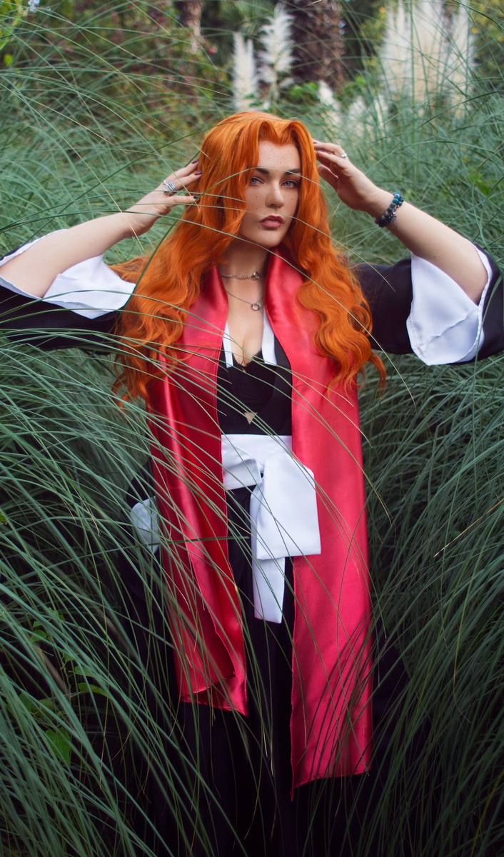 Эта яркая фотосессия переносит нас в мир аниме «Блич», где харизматичная и обаятельная Рангику Мацумото всегда умеет приковывать внимание. Роскошные рыжие волосы, уверенный взгляд и женственная харизма — всё это идеально отражает дух заместителя капитана 10-го отряда. Такой косплей подчеркивает не только красоту персонажа, но и её характер — сочетание лёгкости, силы и скрытой решимости. Фэндом: Блич