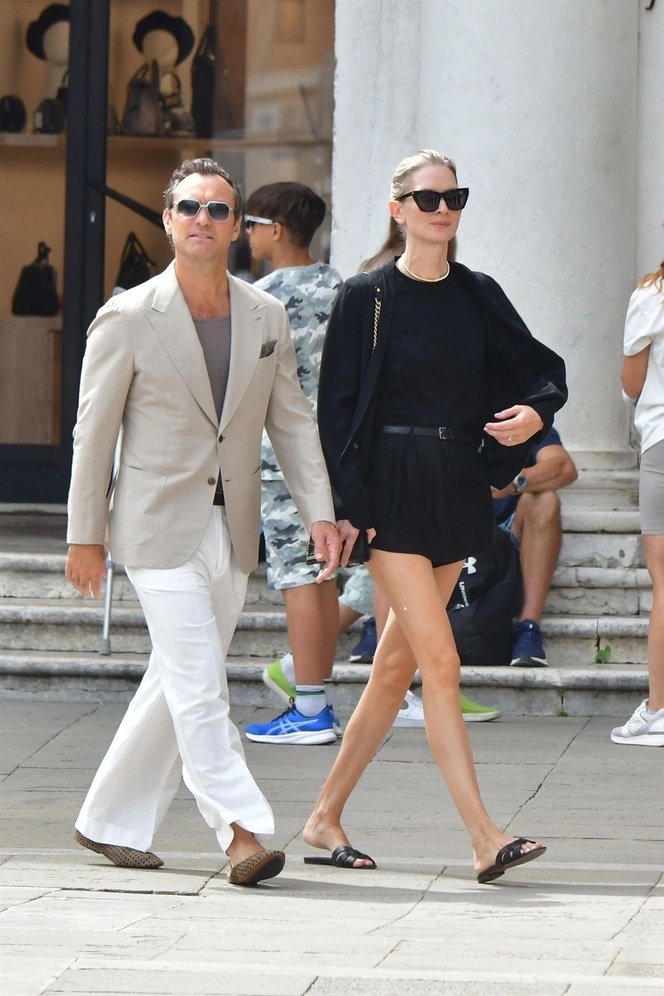 Венеция снова становится ареной не только для фестивальных премьер, но и для неспешных прогулок знаменитостей. На этот раз внимание папарацци привлек Джуд Лоу вместе с супругой Филиппой Коэн — пара вышла в город любви в образах, которые оказались максимально противоположными по настроению. Актер сделал ставку на «тихую роскошь»: светлые тона, расслабленный крой и классическая простота. Такой выбор подчеркивает уверенность и зрелость стиля Лоу, который давно отошел от ярких экспериментов и предпочитает элегантность вне времени. Его выход — пример того, как можно выглядеть свежо и статусно без лишних деталей. Филиппа, напротив, решила сыграть на контрасте. Ее черный кардиган и ультракороткие шорты создают дерзкий акцент и балансируют женственность с элементами повседневной смелости. Такой лук читается как намек на современную городскую эстетику: минимум усилий, но максимум уверенности в себе. Вместе образы пары словно символизируют полярность, которая в итоге работает на гармонию: с