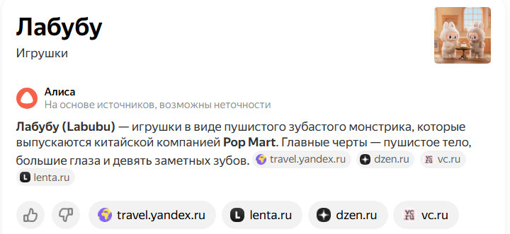 Привет, друзья! Как обычно у нас в тренде - культ одной игрушки или персонажа. Хаги-Ваги мы переболели, анимантроники - тоже А теперь у нас та самая ЛАБУБУ Прежде чем вы начнете плеваться и негативить - давайте почитаем чуть истории, ладно? Прочитав статью, вы все поймете. Обратимся к Алисе и нейросетям: Описание прям один в один с нашим персонажем. Кроме зубов: Сделать уши в сторону, расправить их, убрать оскальную улыбку - прям вот наш Чебурашка. Но есть существенное различие. Пожалуй, самое важное! Наш Чебурашка - милый, добрый, наивный. Он за мир и дружбу. У него во взгляде читается все самое хорошее. А этот звереныш он скорее нацелен напугать и кровушки попить. С такой гримасой он мог стать героем фильма "зубастики". Помните этот фильм? Больше всего в этом всем настораживает популяризация - она молниеносная. За какие-то считанные недели я везде слышу это слово - от детей, от взрослых, в магазинах, на станции, на форумах и каналах. Уже даже появились вот такие изображения с
