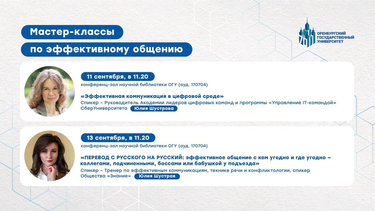 Слова меняют мир! Научись говорить убедительно 💬 Устал от дрожащих коленей перед выступлениями? Мечтаешь уверенно держаться на защите диплома, презентации проекта или даже на сцене? Пришло время прокачать навыки публичных выступлений! 11 и 13 сентября приходи в 11.20 в конференц-зал научной библиотеки ОГУ в аудиторию 170704 на мастер-классы по эффективному общению 🗣 Спикерами выступят тренер по эффективным коммуникациям, технике речи и конфликтологии Юлия Шустрая и руководитель Академии лидеров цифровых команд и программы «Управление ИТ-командой» СберУниверситета Юлия Шустрова. Эксперты расскажут об эффективной коммуникации в цифровой среде и научат общаться с кем угодно и где угодно. Все подробности о каждом мастер-классе ты можешь найти на наших карточках. 👉 Встречи пройдут при содействии компании по разработке ИT-систем для бизнеса Cinimex. Отметим, что 13 сентября вход к аудитории 170704 будет осуществляться через 3 корпус! Не упусти шанс научиться говорить так, чтобы теб