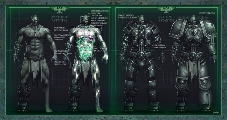 Генетические имплантаты — ключ к превращению подростка в космодесантника. Эти 19 улучшений меняют его тело, делая из обычного человека сверхчеловека Астартес. Каждый имплантат влияет на определённый орган или систему, помогая развитию космодесантника. Процесс сложен и опасен. Он требует точных хирургических операций, глубокого знания генной науки и сильного тела неофита, способного выдержать изменения.