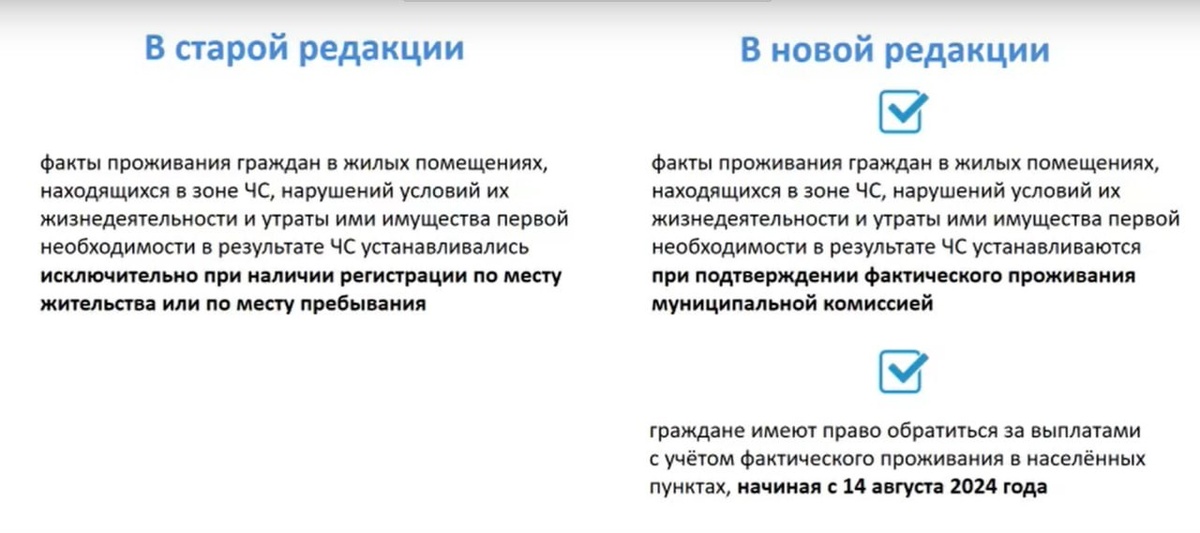 Проживающим в приграничье без регистрации упростили получение выплат Согласно новым методическим рекомендациям МЧС, за получением выплат граждане могут обратиться независимо от наличия регистрации, начиная с 14 августа 2024 года. Если ранее подтвердить факт проживания можно было только с помощью решения суда, то теперь для обращения за помощью подойдут разные документы, подтверждающие пребывание в зоне ЧС. В их числе: договоры аренды жилья; справки с места работы или учёбы; документы об оказании медицинских, образовательных или почтовых услуг по адресу в зоне ЧС. Кроме того, для принятия решения о факте проживания необязательно выезжать на место – документы могут быть предоставлены онлайн и получены в рамках межведомственного взаимодействия органов госвласти и МСУ. «Сейчас пойдёт вал, огромное будет количество обращений. И очень важно, чтобы с первых дней главы очень чётко по регламенту формировали и отрабатывали каждый запрос», – отметил губернатор Вячеслав Гладков. Отметим, чт