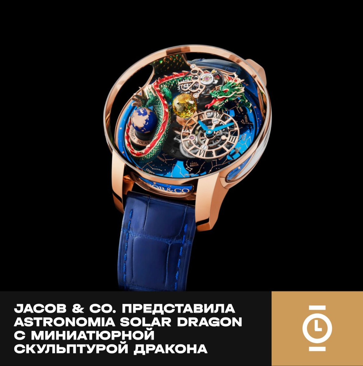 JACOB & CO. ПРЕДСТАВИЛА ASTRONOMIA SOLAR DRAGON С МИНИАТЮРНОЙ СКУЛЬПТУРОЙ ДРАКОНА #новости_WD Jacob & Co. выпустила новую версию своей культовой линии Astronomia — модель Solar Dragon, в которой главным акцентом стала вручную изготовленная золотая или титановая скульптура азиатского дракона. Она обвивает механизм, находясь всего в полумиллиметре от его элементов, и видна со всех сторон через куполообразное сапфировое стекло. Часы представлены в корпусах 44 × 21 мм из розового золота или титана с DLC-покрытием. Внутри работает калибр JCAM42 с одноосевым турбийоном, скелетонизированным циферблатом времени и вращающимся глобусом. В Astronomia Solar Dragon калибр JCAM42 устроен необычным образом. В отличие от классических часов, здесь завод и перевод времени происходят не через привычную заводную головку сбоку, а с помощью двух скрытых складных ключей на задней крышке. Один отвечает за ручной завод механизма (до 48 часов запаса хода). Второй — за перевод стрелок на скелетонизированно
