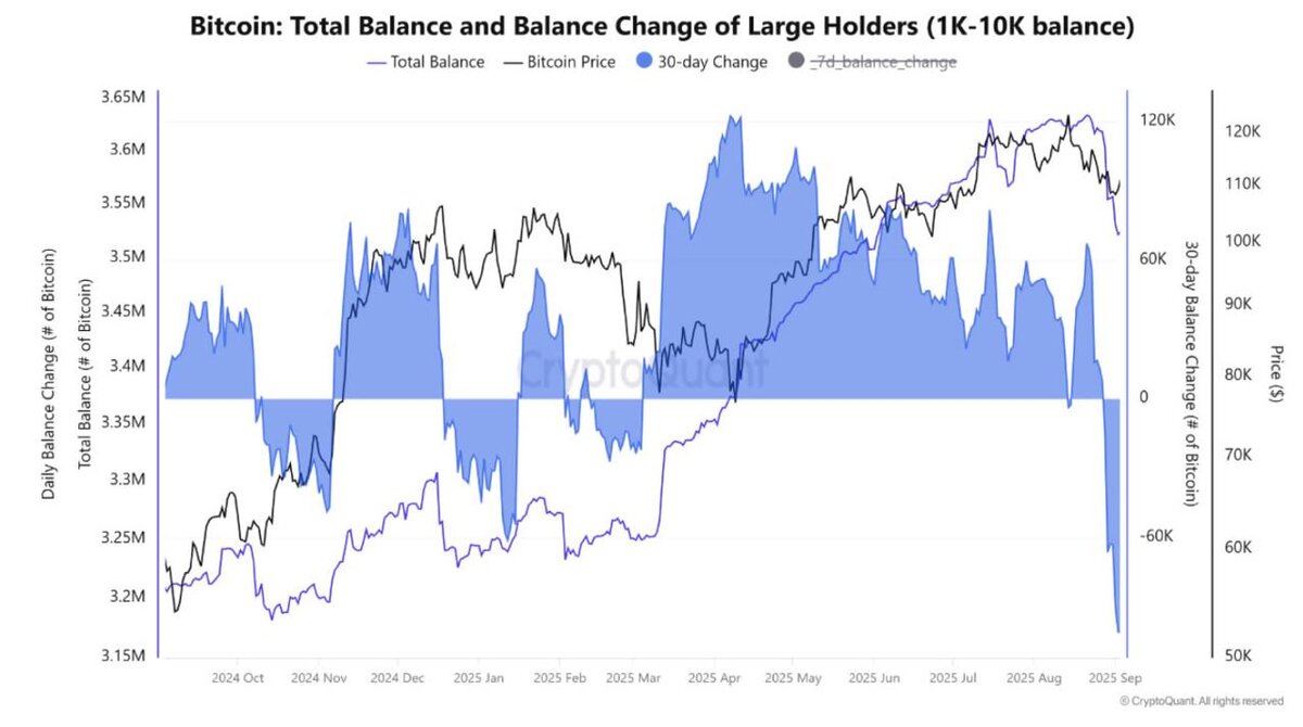 📉 На рынке криптовалют разразилась паника: за последние 30 дней биткоин-киты продали 114,920 BTC (примерно $12,7 млрд) — это крупнейшая распродажа с июля 2022 года. Массовый сброс привёл к падению цены ниже отметки $108,000 и усилил давление на рынок. По данным CryptoQuant, запасы крупных держателей (от 1,000 до 10,000 BTC) значительно сократились. Это сигнал о том, что крупные игроки избегают риска и фиксируют прибыль. Что произошло? 🔍 Пик продаж пришёлся на 3 сентября — именно тогда фиксировался самый сильный объём сброса. В результате краткосрочная ценовая структура была нарушена, и аналитики предупреждают: давление может сохраниться в ближайшие недели. Однако есть и положительные сигналы: к 6 сентября недельный баланс сократился до 38,000 BTC. Это значит, что агрессивные продажи замедляются. Что дальше с ценой? ⚡ Сейчас биткоин торгуется в узком диапазоне $110,000–$111,000. Давление со стороны китов снижается, а институциональные инвесторы и потоки в ETF начинают к