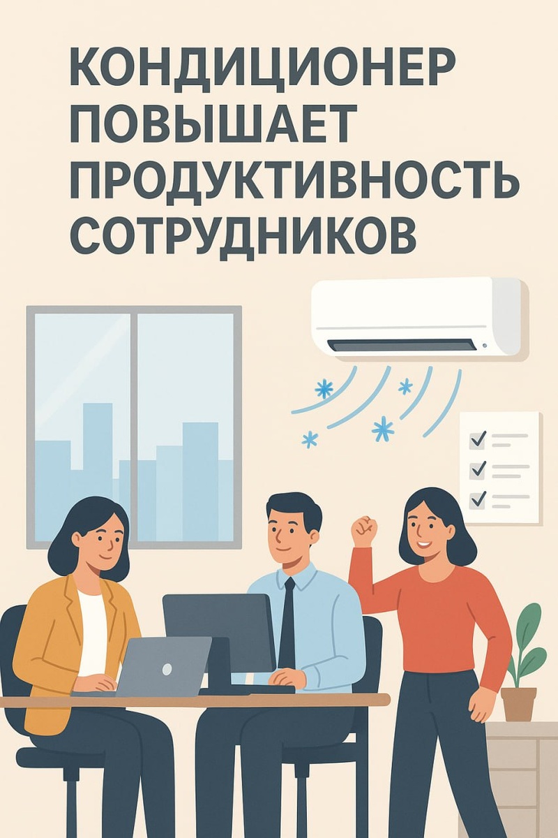 Кондиционер повышает продуктивность сотрудников! Вот почему: 1. Комфортная температура При жаре организм тратит много энергии на охлаждение, из-за чего снижается концентрация и работоспособность. Кондиционер поддерживает оптимальный микроклимат (около 22–24 °C). 2. Снижение стресса и усталости В душном офисе быстрее накапливается раздражительность и усталость. Свежий и прохладный воздух помогает сохранить спокойствие и работоспособность. 3. Лучшее внимание и концентрация Исследования показывают, что при перегреве когнитивные функции падают: люди чаще ошибаются, медленнее принимают решения. 4. Поддержание здоровья Хорошая вентиляция и фильтрация воздуха уменьшают количество аллергенов, пыли и бактерий, что снижает риск заболеваний и прогулов. 5. Энергия и мотивация В комфортной среде сотрудники меньше отвлекаются и чувствуют себя бодрее. 👉 Можно сказать коротко: кондиционер — это не только про комфорт, но и про прибыль компании, потому что здоровые и сосредоточенные сотрудники р