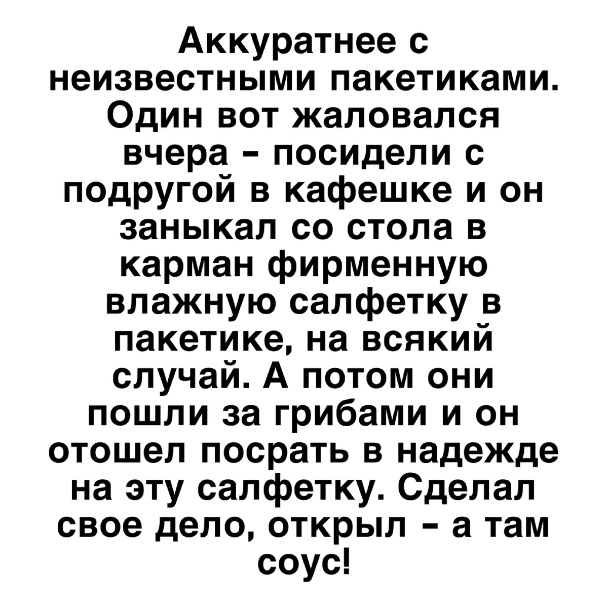 Аккуратнее с неизвестными пакетиками. Один вот жаловался вчера - посидели с подругой в кафешке и он заныкал со стола в карман фирменную влажную салфетку в пакетике, на всякий случай. А потом они пошли за грибами и он отошел посрать в надежде на эту салфетку. Сделал свое дело, открыл - а там соус!