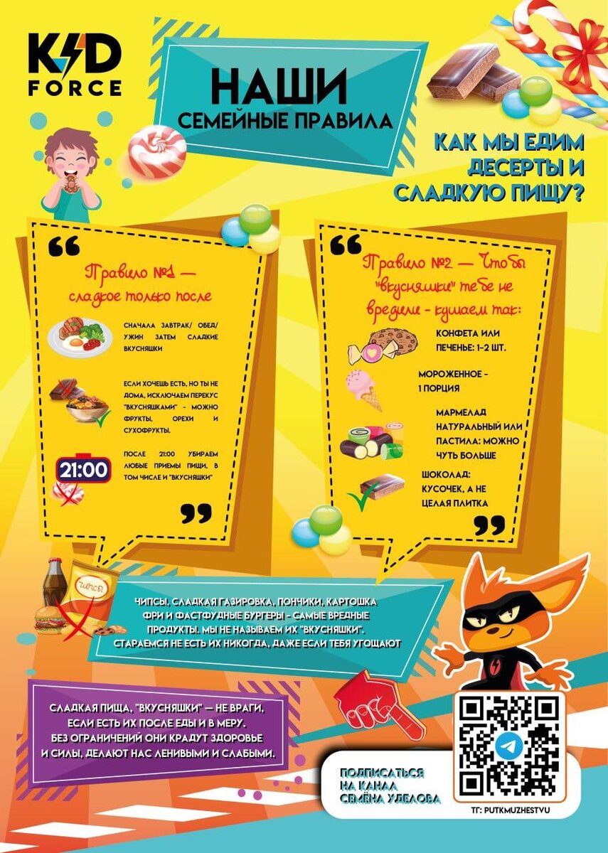 В ответ на пост Помните, говорил про инструмент? Болючая тема про гаджеты и сладкое. Сказать проще, чем сделать. Очень простой инструмент это правила, которым может следовать вся семья. Правила это легко, но не легко им следовать и контролировать, в первую очередь, себя. Помогает геймификация или визуал. Держите визуал, на основе него можете сделать подобное. Ключевые критерии правил: 1. Понятно как выполнить. 2. Понятно зачем выполнять. 3. Легко контролировать. 4. Соблюдают все. У нас дома живем по таким правилам. Но честно, не сразу получилось. Визуал очень помог. Еще есть отдельный будильник, который старшая дочь включает сама, когда начинает смотреть мульты. Ей 6 лет, но мы учимся самоконтролю. А Макс, которому 3 года видит на примере, как вся семья взаимодействует с экранным временем и «вкусняшками». Люблю прикладные вещи, которые легко интегрируются в жизнь. В клубе «Kid Force” выдаем такие при покупке абонемента.