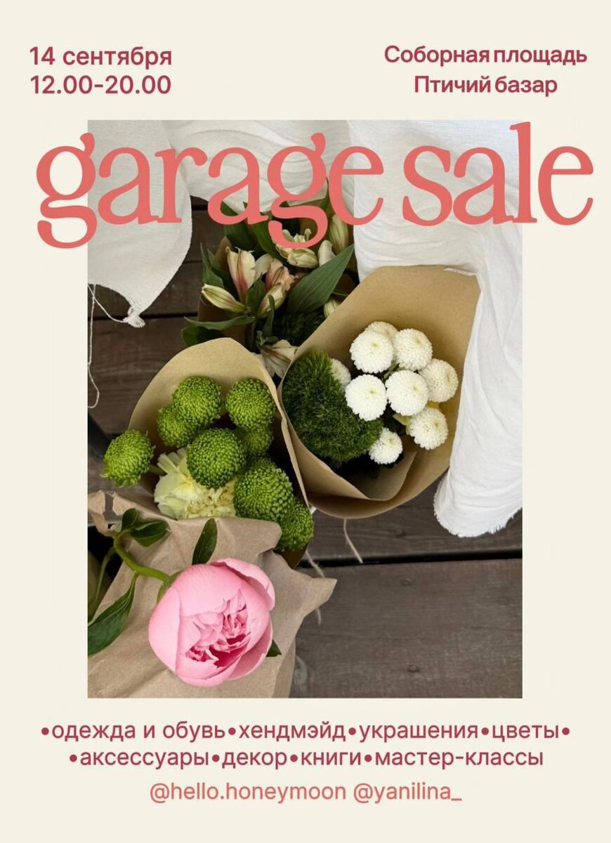 GARAGE SALE 🛍️ 🗓️ 14 сентября 12:00-22:00 📍Соборная площадь, шатёр Птичий базар В развлекательной программе: ▪️13:00 | МК по созданию коллажа Создадите коллаж, наполненный воспоминаниями и уютом, используя личные архивы, семейные фотографии. Вдохнете в фотографии новую жизнь и смыслы. 🏷️ 500₽ Запись у @stacia_an ▪️15:30 | МК по трендовой вышивке на одежде Запись у @marinakazakova_design 🏷️1500₽ *Также на маркет открыт набор участников в таких направлениях: •одежда и обувь •хендмейд •украшения •аксессуары •декор •книги •цветы Подать заявку и уточнить подробности можно у @oyanilina 🏷️ вход на ярмарку свободный #14сентября25