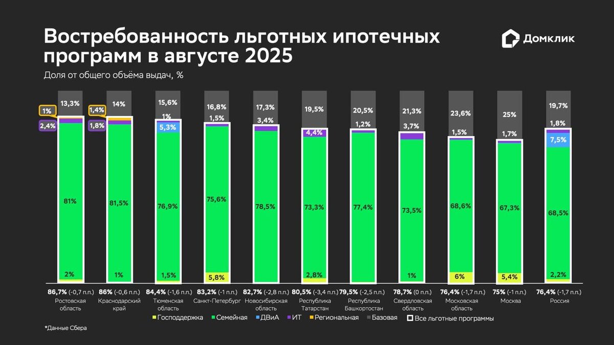 ⚡️ Льготная ипотека в августе: выдачи превысили 200 млрд рублей Аналитики Домклик при этом отмечают, что доля госпрограмм постепенно снижается: с 86% в мае до 80,3% в августе. Растет интерес к рыночной ипотеке — выдачи увеличились на 28,5%. 🟠Лидером остается Семейная ипотека — 183 млрд рублей. Среди регионов по ней лидируют Хакасия, Адыгея и Астраханская область. 🟠Также заметно выросли выдачи по IT-ипотеке (+22%) и Дальневосточной программе. 🟠Рыночная ипотека сильнее всего выросла в Саратовской, Омской и Владимирской областях. ➡️Подробный разбор от аналитиков Домклик — в статье Всё важное и интересное о недвижимости здесь: @domclick 🔆
