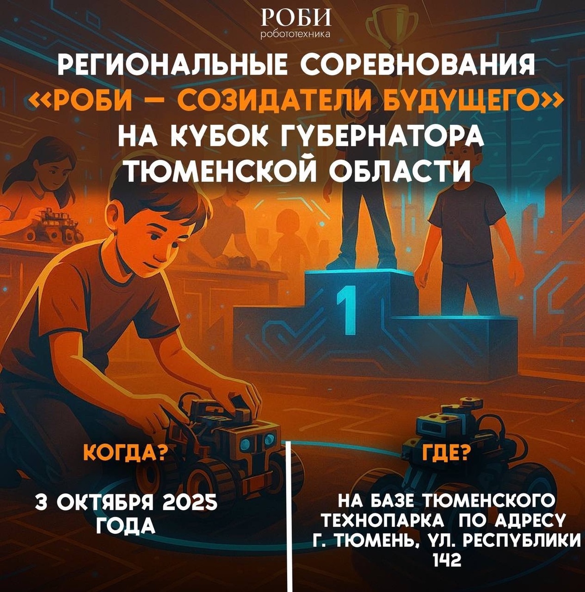 Первый региональный турнир «РОБИ –созидатели будущего» приглашает юных гениев Впервые в областной столице 3 октября на форуме креативных предпринимателей «КПД» пройдут региональные соревнования «РОБИ – созидатели будущего» на Кубок губернатора. Юные инженеры и изобретатели смогут продемонстрировать свои навыки в робототехнике. Событие стартует в Тюменском технопарке (ул. Республики, 142, Зал Атриум): регистрация команд начнется в 9:00, а сами соревнования — в 10:00. Участвовать могут дошкольники, школьники и ребята на семейном обучении, а также дети с ОВЗ — для них предусмотрена отдельная категория. Подробнее