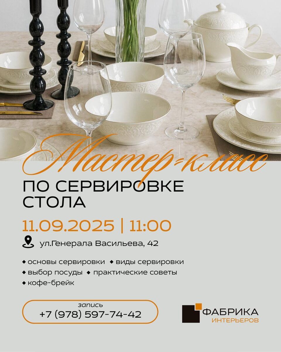 Добрый день! 11 сентября в «Фабрике Интерьеров» состоится мастер-класс, посвящённый искусству сервировки и современным подходам к оформлению стола. ⏰ Время: 11:00 👥 Количество мест: 20 Темы мастер-класса: основы сервировки; виды сервировки; выбор посуды и приборов; практические советы и правила этикета; создание атмосферы в зависимости от повода. В программе предусмотрен кофе-брейк. Запись по номеру: +7(978) 597-74-42