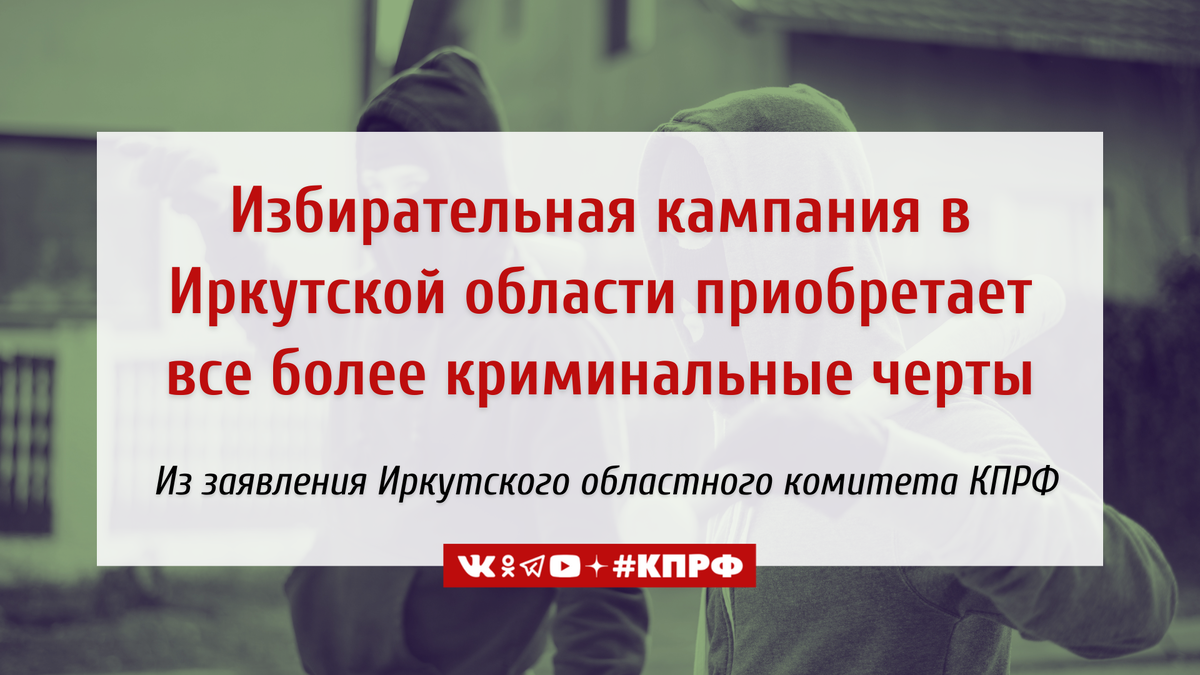 Более того, избирательная кампания в Иркутской области приобретает все более криминальные черты. Вместо того, чтобы в рамках закона и порядка обеспечить конкурентные выборы, предоставив кандидатам равные права и возможности, по надуманным предлогам отстраняются сильные кандидаты от КПРФ, в ход идут запугивания, угрозы жизни и физические расправы.