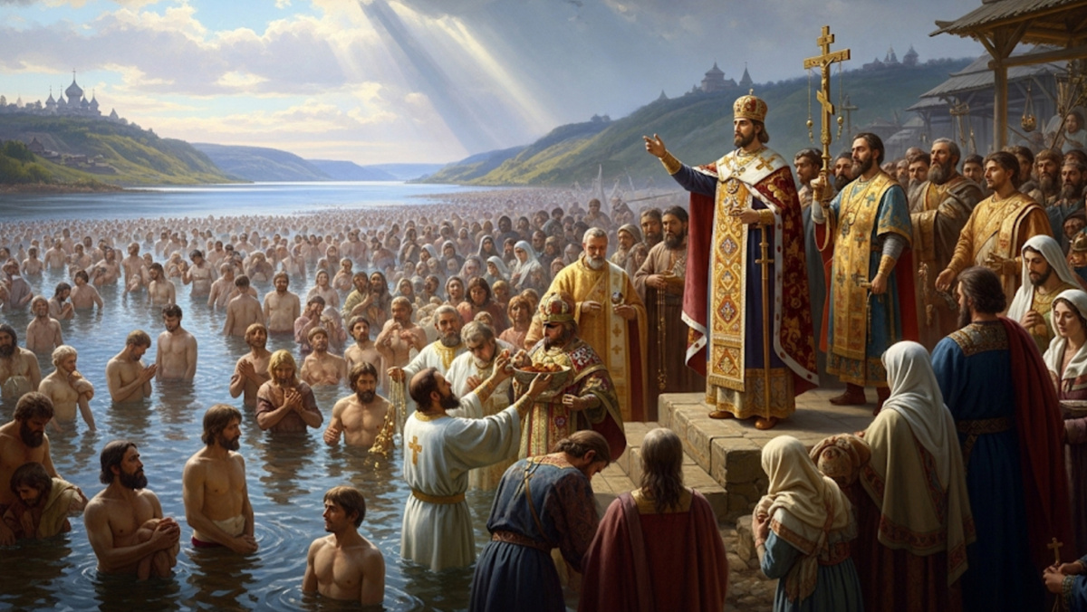 Крещение Руси — начало, но не конец Официальной датой христианизации Древней Руси считается 988 год, когда князь Владимир Святославич крестил киевлян в Днепре. Именно этот акт положил начало государственной поддержке новой веры. Но «крещение Руси» было не одномоментным событием. Оно означало прежде всего принятие христианства на уровне правящей элиты и крупных городов. На деле процесс занял несколько веков: традиции, верования и обряды язычества ещё долго жили в народной культуре, а в отдалённых землях Руси языческие культы существовали параллельно с христианством. В XI–XIII веках в народной среде сформировалось явление «двоеверия» — сочетание языческих и христианских практик. Люди посещали церковь, крестили детей и отмечали христианские праздники, но при этом продолжали гадать, приносить жертвы духам и почитать древних богов. Именно поэтому церковные проповеди XI–XIV веков часто обличали «языческие остатки»: жертвоприношения у рек и рощ, колдовство, почитание солнца и луны. Христианиз