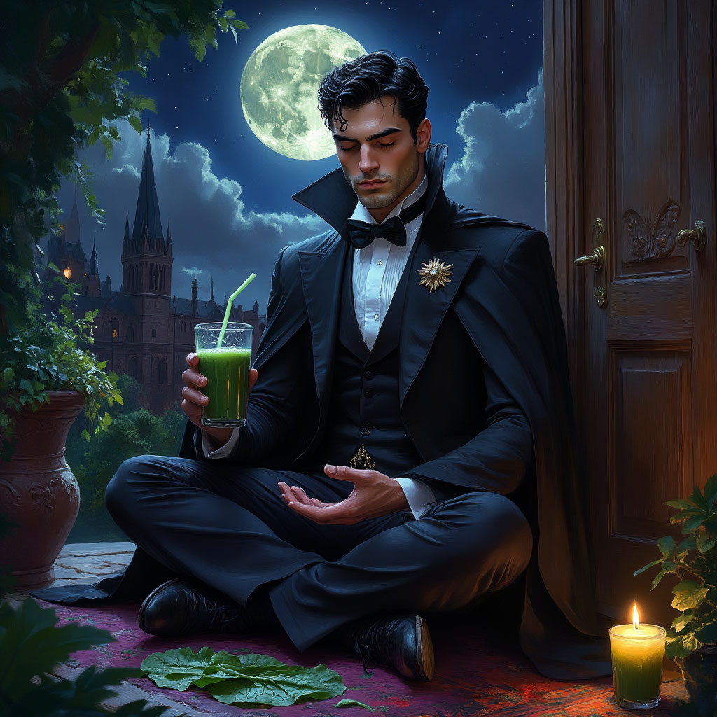 Проблема, однако, заключалась в физиологии. Отказ от крови не убивал его, но запускал странный процесс метаморфозы. Его кожа, обычно фарфорово-бледная, приобрела здоровый оливково-зеленый оттенок. Он обнаружил, что вместо жуткого превращения в туман может... фотосинтезировать. Стоило ему выйти на утреннее солнце (от которого он, к своему удивлению, лишь приятно щурился, а не вспыхивал), как он чувствовал прилив бодрости. По утрам на его подушке лежали не летучие мыши, а проросшие семена авокадо, которые он съедал на ужин. Его вампирские силы угасали: вместо гипноза он мог теперь лишь уговорить кактус быстрее зацвести, а его знаменитый облик летучей мыши превратился в жалкого голубя с залысинами.