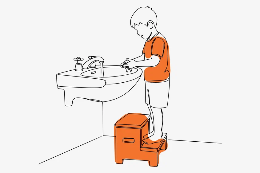 Если нет возможности установить отдельную раковину для ребёнка, то можно купить ему подставку под общую сантехнику.