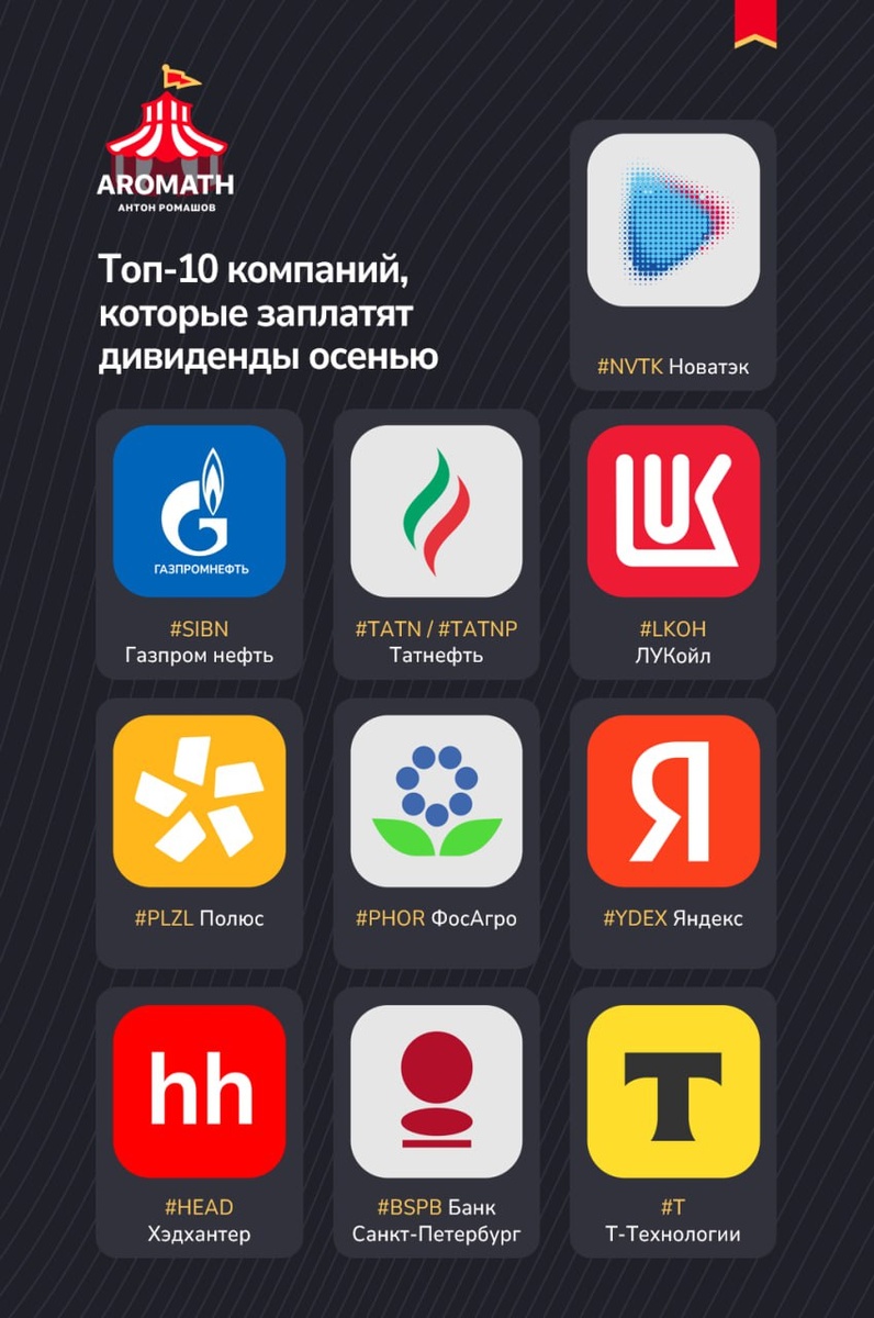 π Π’ΠΎΠΏ-10 ΠΊΠΎΠΌΠΏΠ°Π½ΠΈΠΉ, ΠΊΠΎΡΠΎΡΡΠ΅ Π·Π°ΠΏΠ»Π°ΡΡΡ Π΄ΠΈΠ²ΠΈΠ΄Π΅Π½Π΄Ρ ΠΎΡΠ΅Π½ΡΡ. #NVTK ΠΠΎΠ²Π°ΡΡΠΊ Π‘ΠΎΠ²Π΅Ρ Π΄ΠΈΡΠ΅ΠΊΡΠΎΡΠΎΠ² ΡΠ΅ΠΊΠΎΠΌΠ΅Π½Π΄ΠΎΠ²Π°Π» Π΄ΠΈΠ²ΠΈΠ΄Π΅Π½Π΄ Π² ΡΠ°Π·ΠΌΠ΅ΡΠ΅ 35,50 ΡΡΠ±Π»Ρ Π½Π° ΠΎΠ΄Π½Ρ Π°ΠΊΡΠΈΡ ΠΏΠΎ ΡΠ΅Π·ΡΠ»ΡΡΠ°ΡΠ°ΠΌ ΠΏΠ΅ΡΠ²ΠΎΠ³ΠΎ ΠΏΠΎΠ»ΡΠ³ΠΎΠ΄ΠΈΡ 2025 Π³ΠΎΠ΄Π°. ΠΠΊΠΎΠ½ΡΠ°ΡΠ΅Π»ΡΠ½ΠΎΠ΅ ΡΠ΅ΡΠ΅Π½ΠΈΠ΅ - 24.09.2025. ΠΠ°ΡΠ° ΠΎΡΡΠ΅ΡΠΊΠΈ - 06 ΠΎΠΊΡΡΠ±ΡΡ. #SIBN ΠΠ°Π·ΠΏΡΠΎΠΌ Π½Π΅ΡΡΡ Π‘Π ΡΠ΅ΠΊΠΎΠΌΠ΅Π½Π΄ΠΎΠ²Π°Π» 17,3 ΡΡΠ±. Π½Π° Π°ΠΊΡΠΈΡ. Π‘ΠΎΠ±ΡΠ°Π½ΠΈΠ΅ Π°ΠΊΡΠΈΠΎΠ½Π΅ΡΠΎΠ² Π΄Π»Ρ ΡΡΠ²Π΅ΡΠΆΠ΄Π΅Π½ΠΈΡ - 29.09.2025. ΠΠ°ΡΠ° ΠΎΡΡΠ΅ΡΠΊΠΈ - 13.10.2025. #TATN/#TATNP Π’Π°ΡΠ½Π΅ΡΡΡ ΡΠ΅ΠΊΠΎΠΌΠ΅Π½Π΄ΠΎΠ²Π°Π½ΠΎ 14,65 ΡΡΠ±. Π½Π° ΠΎΠ±ΡΠΊΠ½ΠΎΠ²Π΅Π½Π½ΡΠ΅ ΠΈ ΠΏΡΠΈΠ²ΠΈΠ»Π΅Π³ΠΈΡΠΎΠ²Π°Π½Π½ΡΠ΅. ΠΠΠ‘Π - 6 ΠΎΠΊΡΡΠ±ΡΡ 2025. ΠΠ°ΡΠ° ΠΎΡΡΠ΅ΡΠΊΠΈ - 14 ΠΎΠΊΡΡΠ±ΡΡ 2025. #LKOH ΠΠ£ΠΠΎΠΉΠ» ΠΠΎ ΡΠΎΡΡΠΎΡΠ½ΠΈΡ Π½Π° Π°Π²Π³ΡΡΡ: Π°Π½Π°Π»ΠΈΡΠΈΠΊΠΈ ΠΎΠΆΠΈΠ΄Π°ΡΡ ΠΏΡΠΎΠΌΠ΅ΠΆΡΡΠΎΡΠ½ΡΠ΅ Π΄ΠΈΠ²ΠΈΠ΄Π΅Π½Π΄Ρ Π² ΡΠ°ΠΉΠΎΠ½Π΅ 430β480 β½ Π½Π° Π°ΠΊΡΠΈΡ; Π΄Π°ΠΆΠ΅ 454 β½ Π½Π°Π·Π²Π°Π½Ρ ΠΎΡΠΈΠ΅Π½ΡΠΈΡΠΎΠΌ. Π‘ΠΎΠ²Π΅Ρ Π΄ΠΈΡΠ΅ΠΊΡΠΎΡΠΎΠ² ΠΏΠ»Π°Π½ΠΈΡΡΠ΅Ρ ΡΠ°ΡΡΠΌΠΎΡΡΠ΅ΡΡ Π²ΠΎΠΏΡΠΎΡ Π² ΡΠ΅ΡΠ΅Π΄ΠΈΠ½Π΅ ΡΠ΅Π½ΡΡΠ±ΡΡ, ΡΠ΅ΡΠ΅Π½ΠΈΡ ΠΏΠΎΠΊΠ° Π½Π΅Ρ. #PLZL ΠΠΎΠ»ΡΡ Π‘Π ΡΠ΅ΠΊΠΎΠΌΠ΅Π½Π΄ΠΎΠ²Π°Π» ΠΏΡΠΎΠΌΠ΅ΠΆΡΡΠΎΡΠ½ΡΠ΅ Π΄ΠΈΠ²ΠΈΠ΄Π΅Π½Π΄Ρ 70,85 ΡΡΠ±Π»Π΅ΠΉ Π½Π° Π°ΠΊΡΠΈΡ. Π‘ΠΎΠ±ΡΠ°Π½ΠΈΠ΅ Π°ΠΊΡΠΈΠΎΠ½Π΅ΡΠΎΠ² Π·Π°ΠΏΠ»Π°Π½ΠΈΡΠΎΠ²Π°Π½ΠΎ Π½Π° 30 ΡΠ΅Π½ΡΡΠ±ΡΡ. ΠΡΡΠ΅ΡΠΊΠ° - 13 ΠΎΠΊΡΡΠ±ΡΡ. #PHOR Π€ΠΎΡΠΠ³ΡΠΎ Π Π΅ΠΊΠΎΠΌΠ΅Π½Π΄ΠΎΠ²Π°Π½ Π΄ΠΈΠ²ΠΈΠ΄Π΅Π½Π΄ Π² ΡΠ°Π·ΠΌΠ΅ΡΠ΅ 387 ΡΡΠ±Π»Π΅ΠΉ. ΠΠΠ‘Π - 11 ΡΠ΅Π½ΡΡΠ±ΡΡ. ΠΠ°ΡΠ° ΠΎΡΡΠ΅ΡΠΊΠΈ - 1 ΠΎΠΊΡΡΠ±