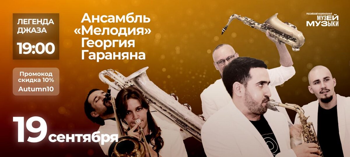 19 сентября вас ждет джазовый вечер с Ансамблем МЕЛОДИЯ Георгия Гараняна! В программе: ностальгия, музыка из советских фильмов и виртуозный стиль исполнителей. 🎺 Наши залы — это место, где музыка звучит особенно проникновенно, а этот оркестр заставит ваше сердце биться в ритме джаза. Приводите друзей и не забудьте хорошее настроение! Очень жду вас, чтобы разделить эти эмоции! 🎷 А для наших внимательных читателей – приятный бонус! Промокод Autumn10, который даст скидку 10% при покупке билета 🤫