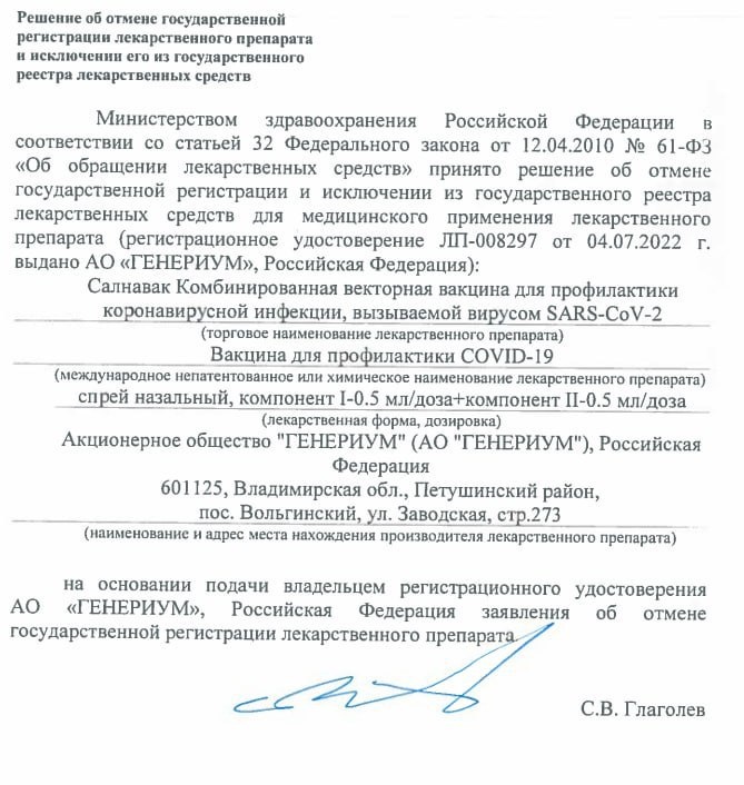 Галя, у нас отмена Компания ГЕНЕРИУМ подала заявление об отмене гос. регистрации назального спрея Салнавак. Вакцина была зарегистрирована по ускоренной схеме в 2022 году и предназначалась для профилактики коронавирусной инфекции. Новости фармации одной строкой. Подписаться