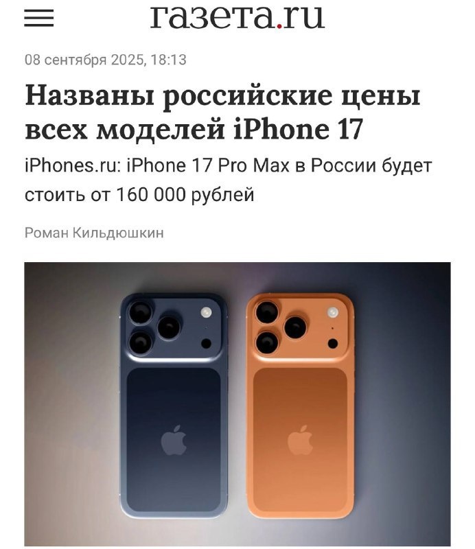 ⚡️ Цены на iPhone 17 в России СМИ назвали ориентировочные цены iPhone 17 – в первые дни модель будет стоить до 160 тысяч рублей, потом – около 80 тысяч. iPhone 17 Air и 17 Pro – до 182 тысяч в начале, затем 110-120 тысяч. iPhone 17 Pro Max – старт от 208 тысяч, потом до 140 тысяч. @technosplit