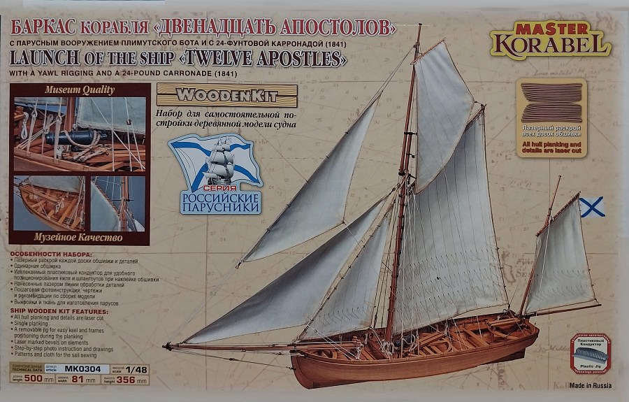 Отечественный производитель «Мастер Корабел» выпустил очередной набор для постройки деревянной модели. На этот раз прототипом послужил 20 весельный баркас с флагмана Черноморского флота 120-ти пушечного корабля «Двенадцать апостолов» на 1841г. В соответствии архивными чертежами прототип имел конструкцию, которая легко могла трансформироваться в варианты с различным расположением 24-фунтовой карронады, поэтому набор выпускается в 2-х вариантах: Артикул МК0304D 42-футовый БАРКАС (десантный вариант) корабля «Двенадцать апостолов» с 24-фунтовой карронадой. Особенностью данного варианта является отсутствие парусного вооружения и установка 24-фунтовой карронады на носовом погоне судна. Артикул МК0304 42-футовый БАРКАС корабля «Двенадцать апостолов» с парусным вооружением плимутского бота и 24-фунтовой карронадой расположенной на круглом погоне по центру судна. Для изготовления рангоута, такелажа и парусов в набор дополнительно входят чертежи и элементы такелажа, заготовки рангоута, нити, тк