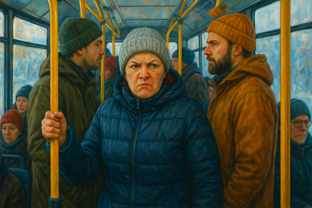 Металлический поручень оказался холодным даже сквозь вязаные перчатки, и Вера устроилась между двумя мужчинами в объёмных зимних куртках, чувствуя, как её сумка давит в бок.