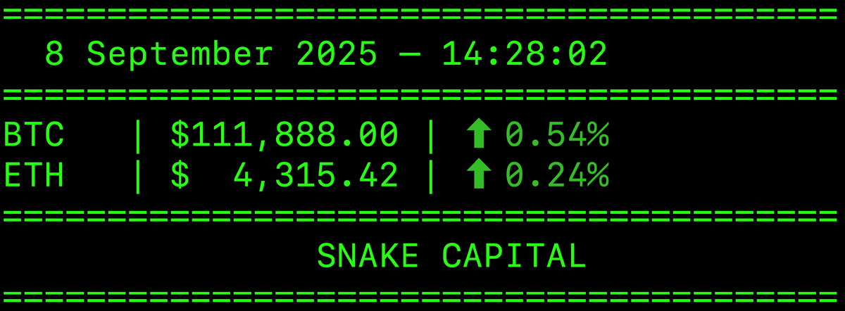 Bitcoin (BTC) торгуется около $111,881, с дневным диапазоном $110,685–$112,134. Ethereum (ETH) стоит приблизительно $4,315, с внутридневным колебанием от $4,271 до $4,335. Прогнозы и ключевые уровни: Общая картина: Bitcoin демонстрирует устойчивость и живой интерес со стороны институционалов. Колебания вокруг $110–112 тыс. сигнализируют о вызревании нового тренда — возможен прорыв выше $120 тыс. или кратковременная коррекция к $105–100 тыс., если усилия покупателей ослабнут. Ethereum продолжает удерживать высокие уровни после недавнего всплеска. Однако давление сезонности и техническая консолидация указывают на потенциал отката. Тем не менее долгосрочные драйверы — ETF, функциональность платформы, DeFi и NFTs — остаются ключевыми, особенно при прорыве выше $4,370. Рекомендации Snake Capital: Вывод: Crypto-пространство динамично и гибко реагирует на макрофакторы, регуляторные сигналы и технологический прогресс. Правильная стратегия — сочетать базовые криптоактивы (BTC, ETH) с перспектив