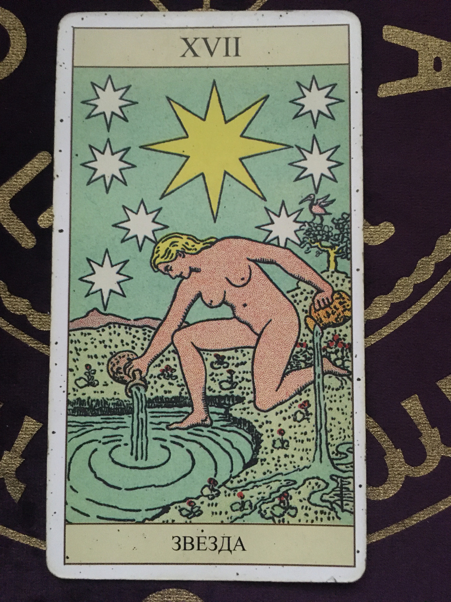 Перед нами — обнаженная фигура (часто женская), символ крайней уязвимости, открытости и чистоты после крушения всех защит (Башни). Одной ногой она на земле, другой — в воде, символ баланса между сознанием и подсознанием. Она льет воду из двух кувшинов: один — в водоем (очищение эмоций, исцеление прошлого), другой — на землю (воплощение новой реальности). Над ней сияет одна большая звезда (ее высшее «Я» или душа) и семь меньших (планеты, чакры, дни недели — символ гармоничного устройства вселенной).