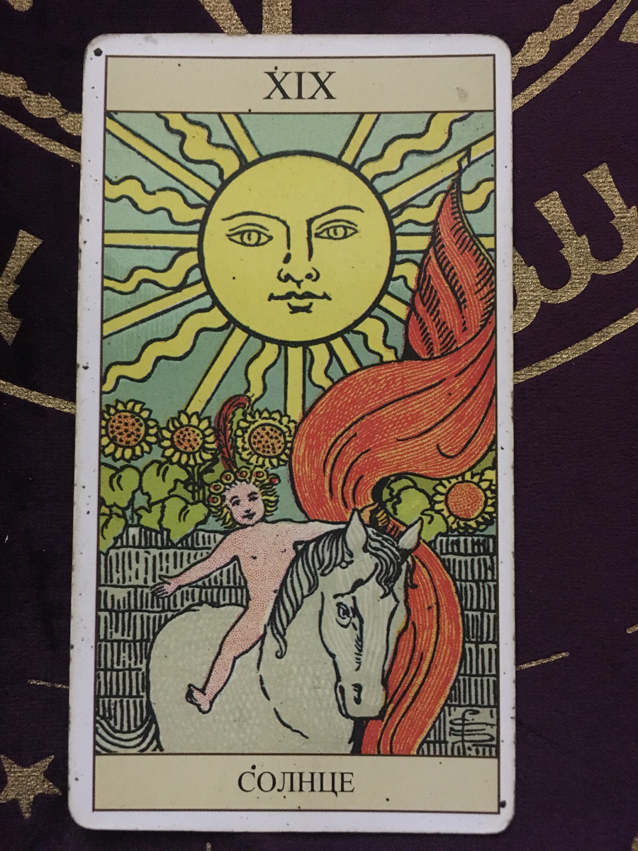 Мы прошли через страхи и иллюзии Луны. Но что ждет нас на другом конце туннеля? Что, если за всеми испытаниями и работами над собой нас ждет не что-то сложное и возвышенное, а простое, ясное и совершенное? Встречайте архетип абсолютной радости, успеха и безоговорочного счастья — Солнце. Мир в Совершенной Гармонии Перед нами — яркое, сияющее солнце, чье лицо часто похоже на лицо аркана Звезда, но теперь оно сияет во всей своей мощи. Под ним — маленький ребенок, обнаженный и абсолютно беззаботный, символ чистого, настоящего «Я», освобожденного от масок и условностей. Он едет на белой лошади (символ очищенной жизненной силы и витальности), держа в руках красный стяг (символ победившей жизненной энергии). Позади — стена, символ пройденных этапов и защищённости, а на клумбах растут подсолнухи, повернутые к свету. Солнце — это архетип Радости, Успеха, Просветления, Истины и Целостности. Это состояние, когда внутреннее и внешнее находятся в полной гармонии. Это не счастье, зависящее от обстоя