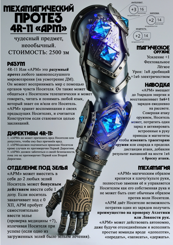 С этим протезом связана небольшая история: Мы играли в ДнД 5е. Моему персонажу (полуэльф-плут) оторвали в битве руку Дретчи и он провалил все СБ от смерти. Наш демонический покровитель перед тем как воскресить моего персонажа вселился в его тело и оторвал руку у персонажа другого игрока (Человек-чародей) и заставил нашего Ксенохимика (Алхимик-орк) пришить её моему персонажу. Когда я писал Мастеру про эту руку накинул лучшие каламбуры которые смог придумать: -Просто на данном этапе некоторые из наших персонажей так скажем имеют недостаточно конечностей что явно не с руки. -Мы конечно могли бы "Махнуть на это рукой" (если бы она у нас была) -Алд там вроде как получается "Отбился от рук" (по крайней мере от одной точно) -Но он, как я понял "не опускает руки" (разве только одну) -Похоже что ему не помешала бы "Рука помощи". Подписаться на Пикабу Познавательный. и Пикабу: Истории из жизни.