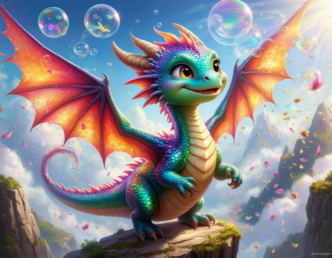 Звали его Пыхтелка. Он был маленький, изящный, и его радужная чешуя переливалась на солнце всеми цветами, словно мыльный пузырь. Но пока его сородичи учились летать сквозь тучи и плавить скалы, Пыхтелка осваивал… чихание. Только не простое, а очень особенное. Вместо грозного пламени у него получались самые неожиданные и совершенно бесполезные, на взгляд других драконов, вещи: облака душистого мыльного пузыря, конфетти из засушенных лепестков или легчайшая пыльца, вызывающая безудержный смех.