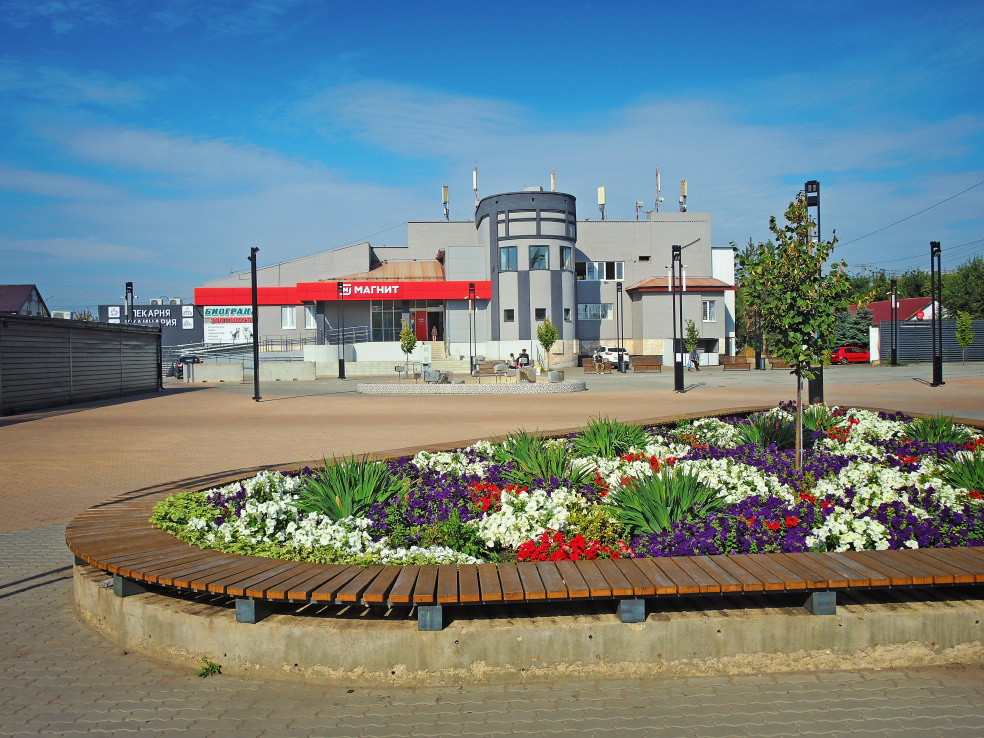Центральная площадь - площадь Мира. Именно тут начали попадаться засохшие кашпо. Фонтан тут тоже не работал. Музей опять закрыт. Переходить туда смысла не увидел. Снова просто дежурный кадр. На нём видны здание отдела ЗАГС, совмещённое с выставочным центром. За ним - дворец культуры.
