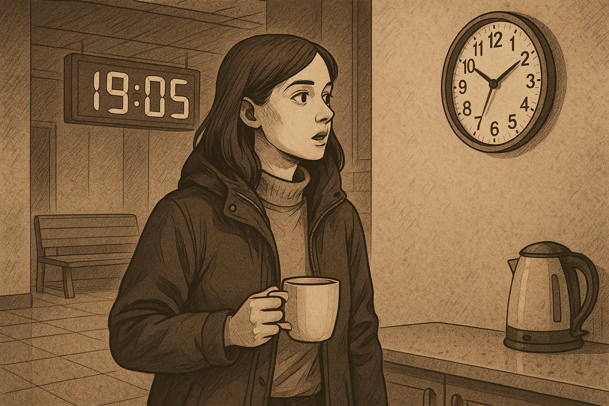 В тот день я училась во вторую смену, и занятия закончились, как обычно, в 18:45. Я забрала куртку из гардероба и направилась в холл, где висели большие электронные часы. Взглянув на них, я отметила время — 19:05. Ничего необычного: накинула куртку, вышла на улицу, где уже сгущались сумерки, и села в трамвай. Поездка была привычной — тряска, шум, толпа уставших людей. После пересадки ещё 15 минут пешком от остановки до дома. Я вошла в квартиру, бросила сумку, поставила чайник и взяла кружку, чтобы налить чай. И тут моё сердце пропустило удар: кухонные часы показывали 19:15.