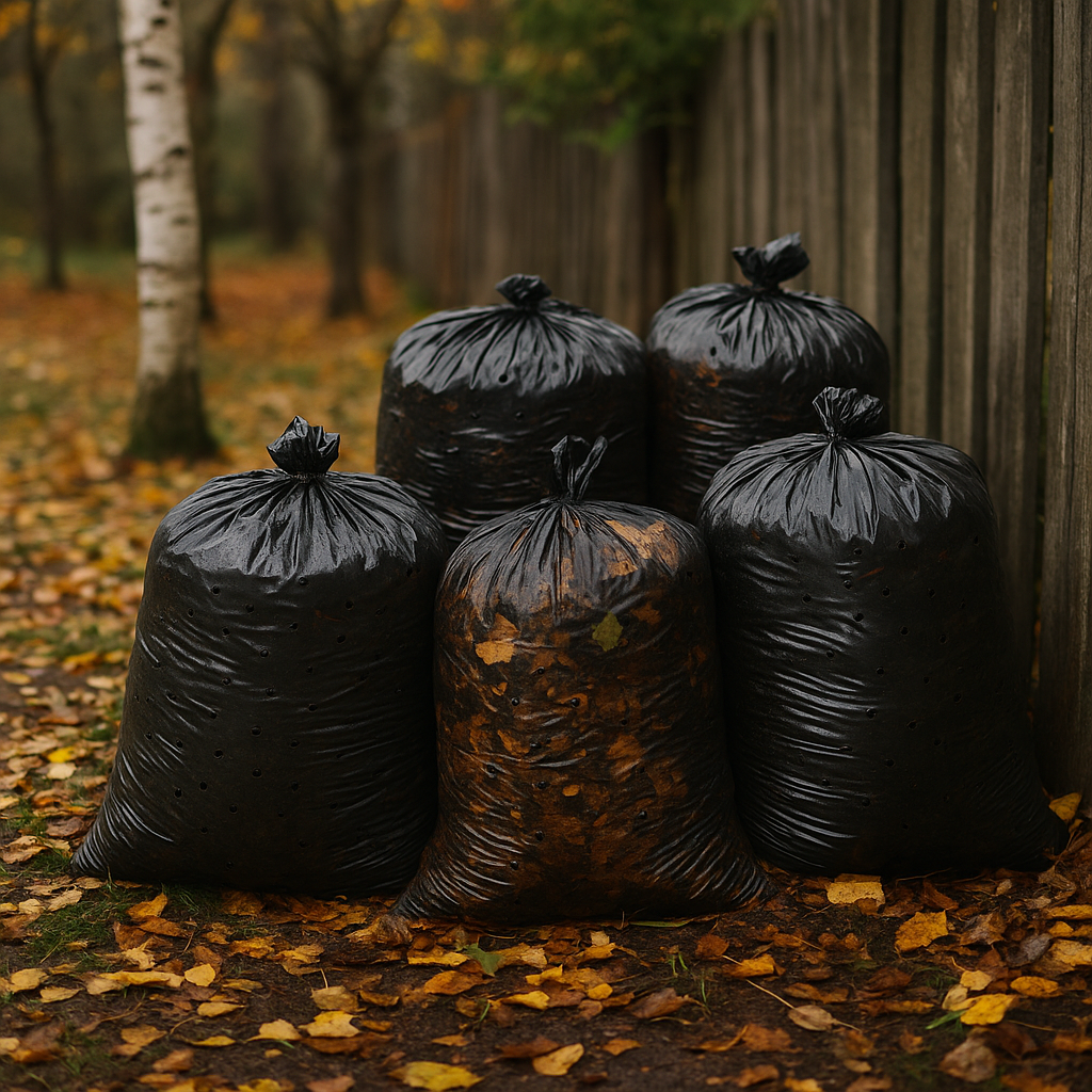 Не кладу: больные листья с активными пятнистостями и мучнистой росой, сильно поражённые грушевой/яблонной паршой, а также грецкий орех (джуглон тормозит рост). Их лучше в горячий компост. • Плотные чёрные мешки 120–160 л или строительные мешки.