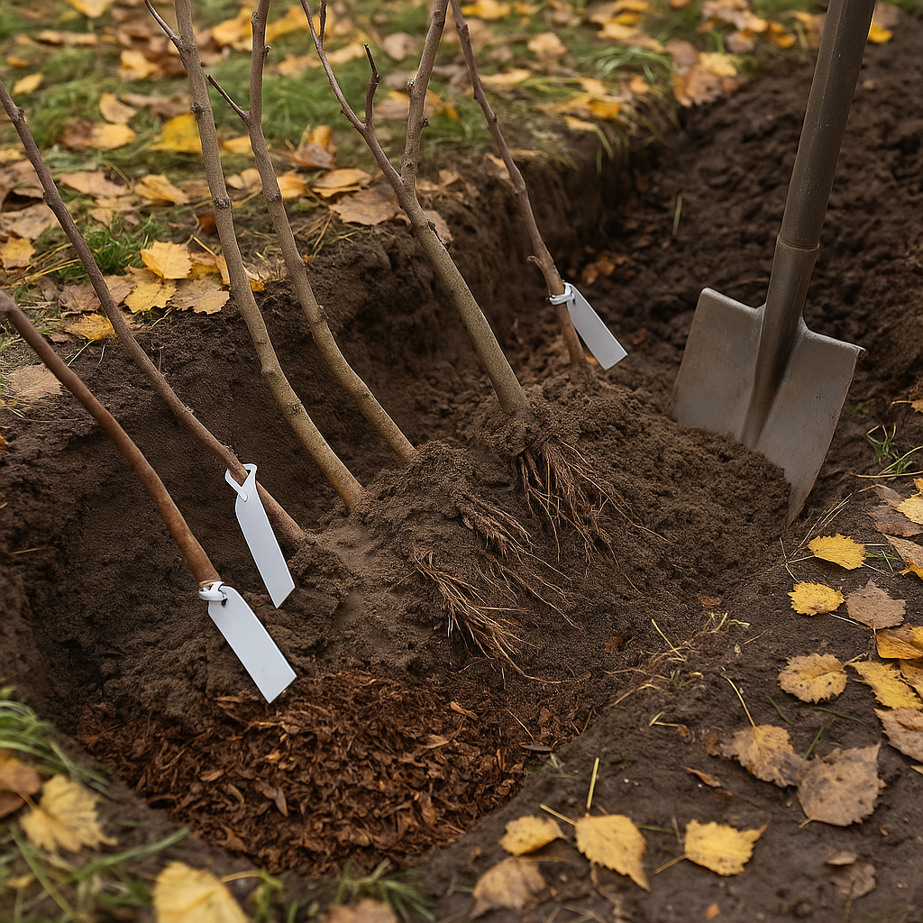 Осенью саженцы часто приезжают раньше посадочных «окон», а земля ещё тёплая. В таких случаях я делаю прикоп — временное «общежитие» для корней. За пару часов можно устроить безопасную стоянку до ноябрьской посадки без подсушивания, плесени и погрызов.
