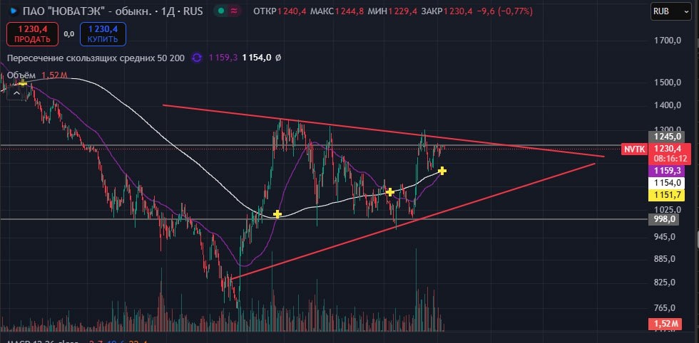 #NVTK #НОВАТЭК В данный момент строит равносторонний треугольник. 🟢Верхняя стенка треугольника, откуда оттолкнулся и сейчас строит разворотную фигуру - 1282. 🔽Поддержка 1155, как только пробьет и закрепите пойдёт до нижней стенки треугольника, и вероятно, увидим падение до 1056 руб. 🔔В данный момент нужно торговать по течению рынка, основное движение у нас сейчас нисходящее . Соблюдайте риск менеджмент. НЕ ИИР