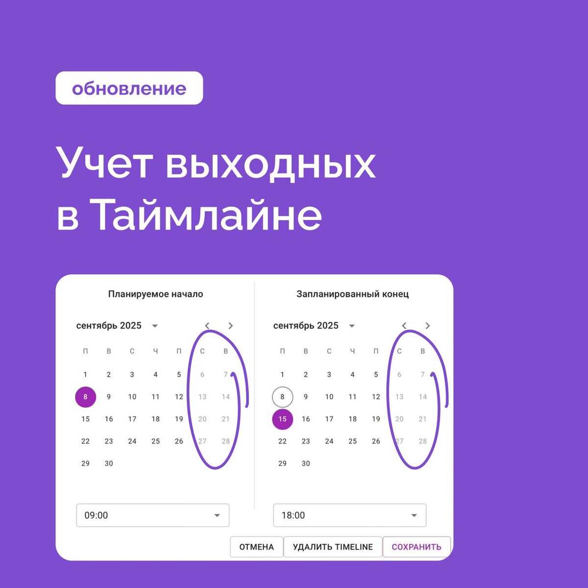 Обновление: учет выходных в Таймлайне 🏖 Теперь в Таймлайне выходные дни отображаются серым цветом и недоступны для выбора дат начала и окончания задач. Это поможет планировать сроки реалистично, не закладывать работу на выходные и избегать лишних переносов. Вы сами можете задать рабочие дни и часы в настройках Таймлайна. По умолчанию действует стандартный режим: пн–пт, 9:00–18:00. Если всё же создать карточку на выходной, Kaiten автоматически перенесет дату старта или завершения на ближайший рабочий день. Подробности — в инструкции.