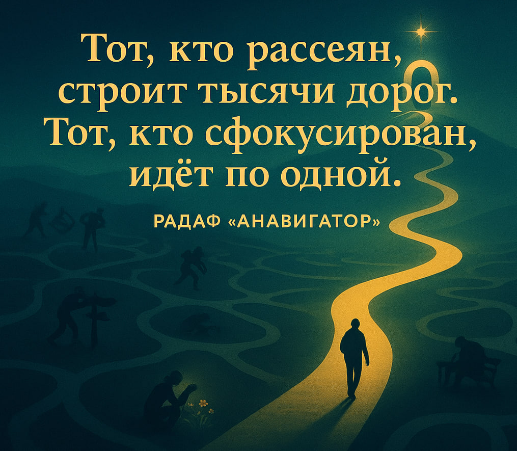 Возвращайтесь к одной главной цели каждый раз, когда тянет разветвиться в разных направлениях. Короткие «мне сейчас важно только то, что ведёт меня к цели» — это практический способ возвращать внимание к главному.