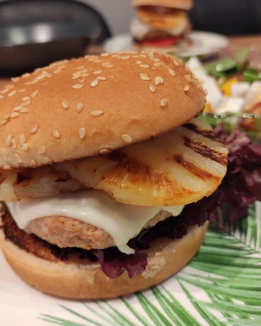 ...И да, это тот самый бургер, который заставит вас забыть о всех диетах и просто наслаждаться жизнью! Выходные. Утро начинается не с будильника, а с запаха кофе и мыслей: «Что бы такого вкусного приготовить, чтобы и быстро, и чтобы все ахнули?». И вот он — момент истины. Бургер. Но не обычный, а с изюминкой, которая превращает его из простой булки с котлетой в кулинарный шедевр. Ананас! Да-да, тот самый сладкий, сочный, слегка обжаренный на гриле ананас, который добавляет бургеру тропическую нотку и заставляет вкусовые рецепторы танцевать самбу. Этот бургер я готовлю, когда хочу удивить гостей или просто сделать выходной день немного ярче. И поверьте, он того стоит! 🍔 Почему этот бургер стоит приготовить в выходной: · Игра контрастов: Сочная котлета из индейки, сладкий ананас, пикантный сыр и хрустящий салат — это взрыв вкуса в каждом укусе. · Быстро и просто: Весь процесс занимает не больше 30 минут, а результат выглядит как блюдо из ресторана. · Эмоции: Такой бургер — это не просто