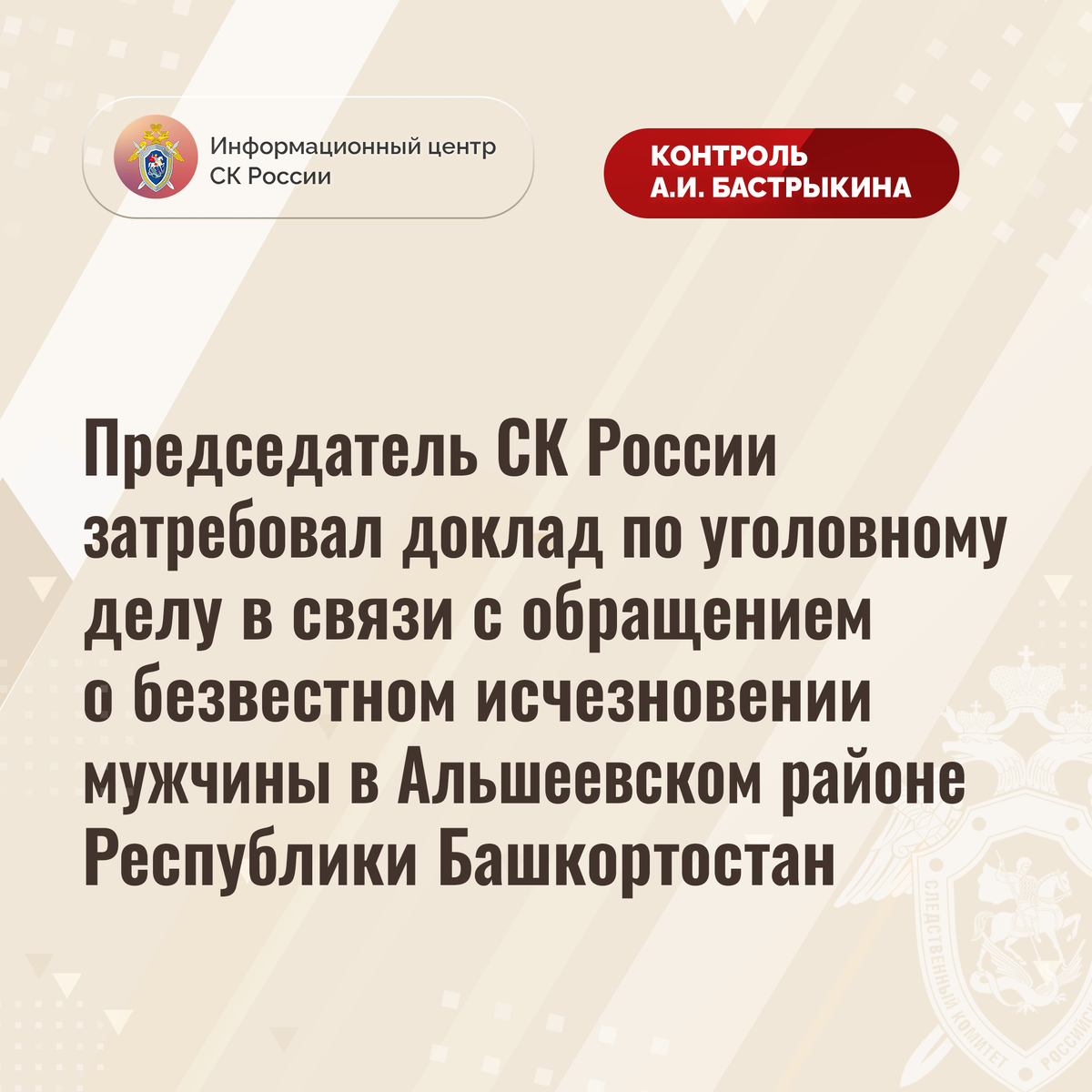 Председатель СК России затребовал доклад по уголовному делу в связи с обращением о безвестном исчезновении мужчины в Альшеевском районе