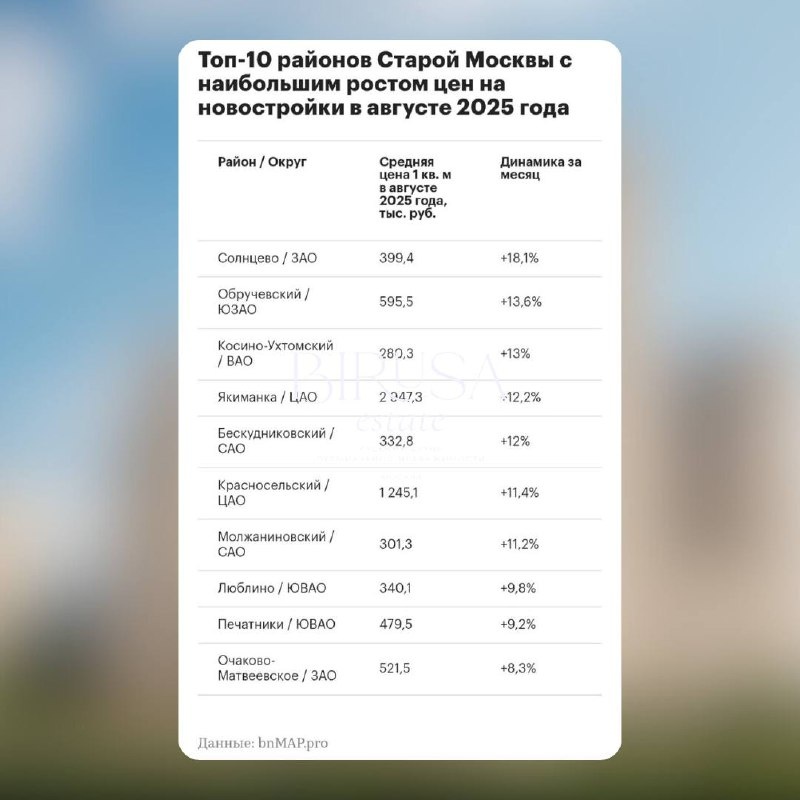 Районы, где откладывать покупку квартиры уже опасно Москва снова удивляет: в августе цены на новостройки в некоторых районах буквально рванули вверх. Если вы думали: «подожду ещё месяцок» — вот список локаций, где ждать уже действительно рискованно: • Солнцево — +18,1% за месяц (399,4 тыс. руб. за кв.м) • Обручевский — +13,6% (595,5 тыс. руб.) • Косино-Ухтомский — +13% (280,3 тыс. руб.) • Якиманка — +12,2% (2,94 млн руб. за кв.м) • Бескудниковский — +12% (332,8 тыс. руб.) Важно: если вы думаете о покупке, сейчас самое время обсудить стратегию. _______ 🔥Запишитесь на бесплатную консультацию — мы поможем найти варианты, где ещё можно зафиксировать адекватную цену, пока рынок не улетел окончательно.