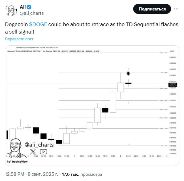 Цена Dogecoin может пойти на спад, поскольку индикатор TD Sequential указывает на сигнал к продаже!