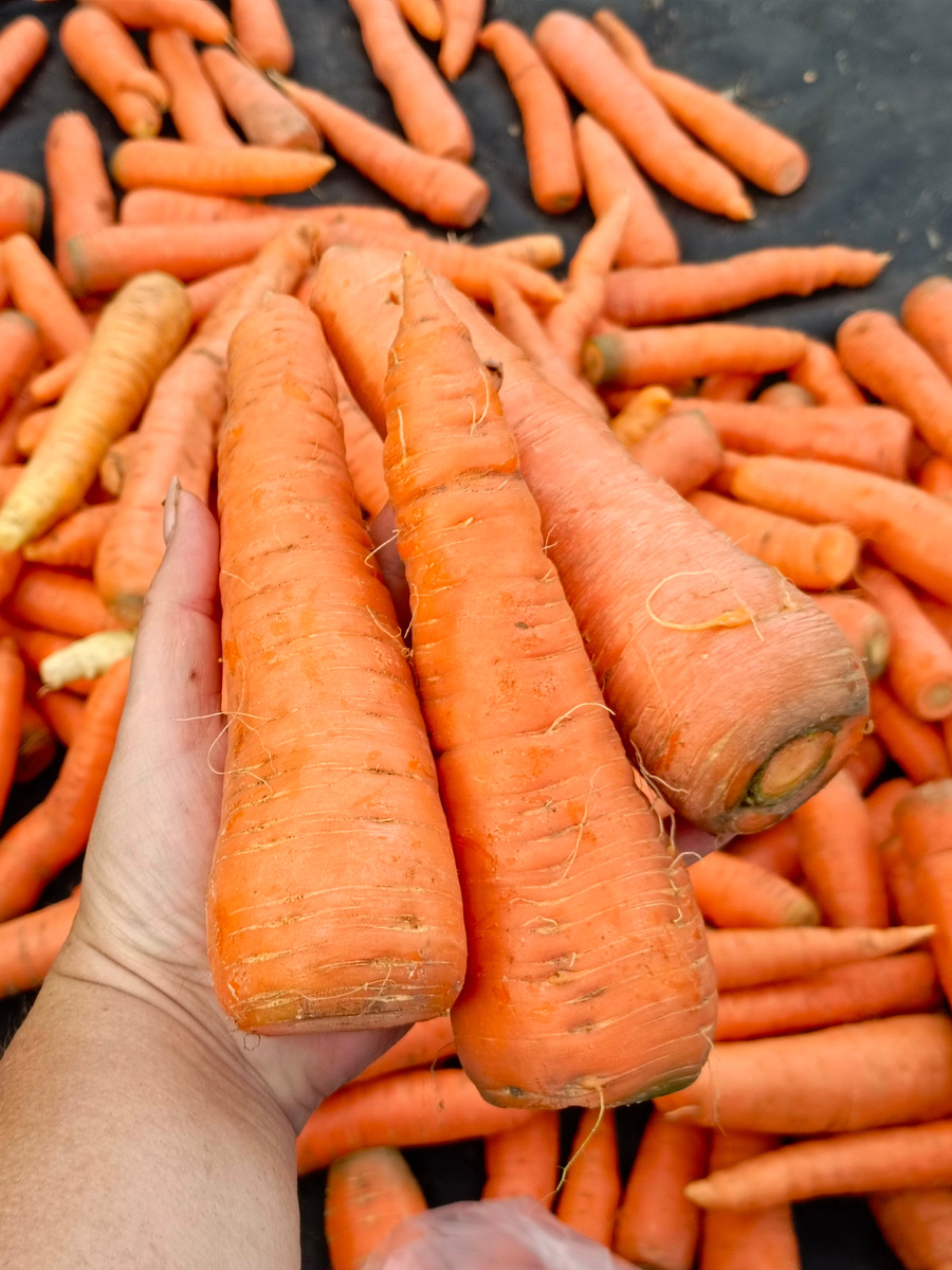 Уф! Сегодня я просто вымотана. Силы не те, чувствую себя неважно, болезнь немного отступила, но все же чувствуется слабость во всем теле. Но работа не ждет - никто за нас не сделает то что нужно. Приходится собирать себя в кулак и продолжать трудиться, несмотря на недомогание. Вот вытащила морковку. Получилось два ящика отличной, отборной морковки и один ящик с некондицией. Хотя если честно, и в некондиции морковка неплохая, просто чуть мелковата. Крупную я обрезала, помыла , обсушила на свежем воздухе и сложила в плотные пакеты. Я храню морковку именно в пакетах. А ящик с некондицией забрала домой, завтра почищу, и потру её на тёрке. Тоже сложу в пакеты и заморожу. Будет отличная заготовка для пассировки, хоть в суп хоть на второе, везде пригодится. Морковь, свеклу и картошку сегодня же увезли в погреб. Помидорчики в этом году просто чудо! Такие крупные, что в руке не помещаются. Сорт Незнаю к сожалению. Это меня " угостили" рассадой. Ну и черри тоже полно и красные и желтеньк