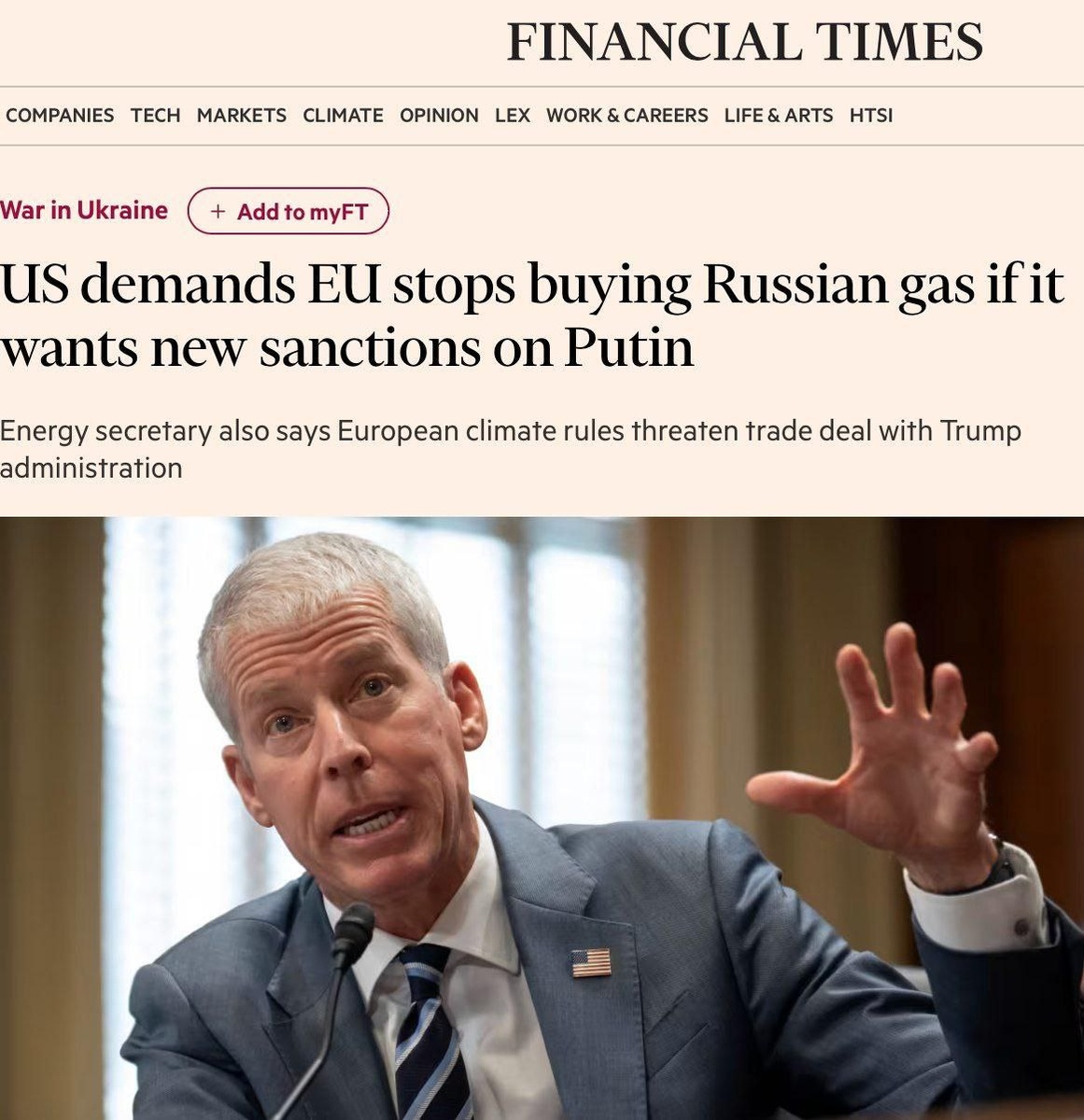 США ставят ЕС перед выбором: хотите санкции – прощайте, российский газ и нефть 🤷🏻♂️ По информации Financial Times, Штаты предложили Европе простую «математику»: откажитесь от российского топлива, и мы введем более жесткие санкции против Москвы. Взамен – наш сжиженный природный газ и бензин по ценам, которые заставят вас вспомнить о «хороших старых временах». Министр энергетики США Крис Райт не стал врать: если Европа решит разорвать связи с Россией, санкции станут еще «агрессивнее». А значит, европейцы будут вынуждены раскошелиться на американское топливо, при этом с благодарностью кивать в сторону океана за такую «возможность». Так что готовьтесь, европейцы. Вы будете платить за газ и нефть в разы дороже, а потом еще и благодарить дядюшку Сэма за введенные санкции супротив России Lesen Sie weiter unten auf Deutsch...