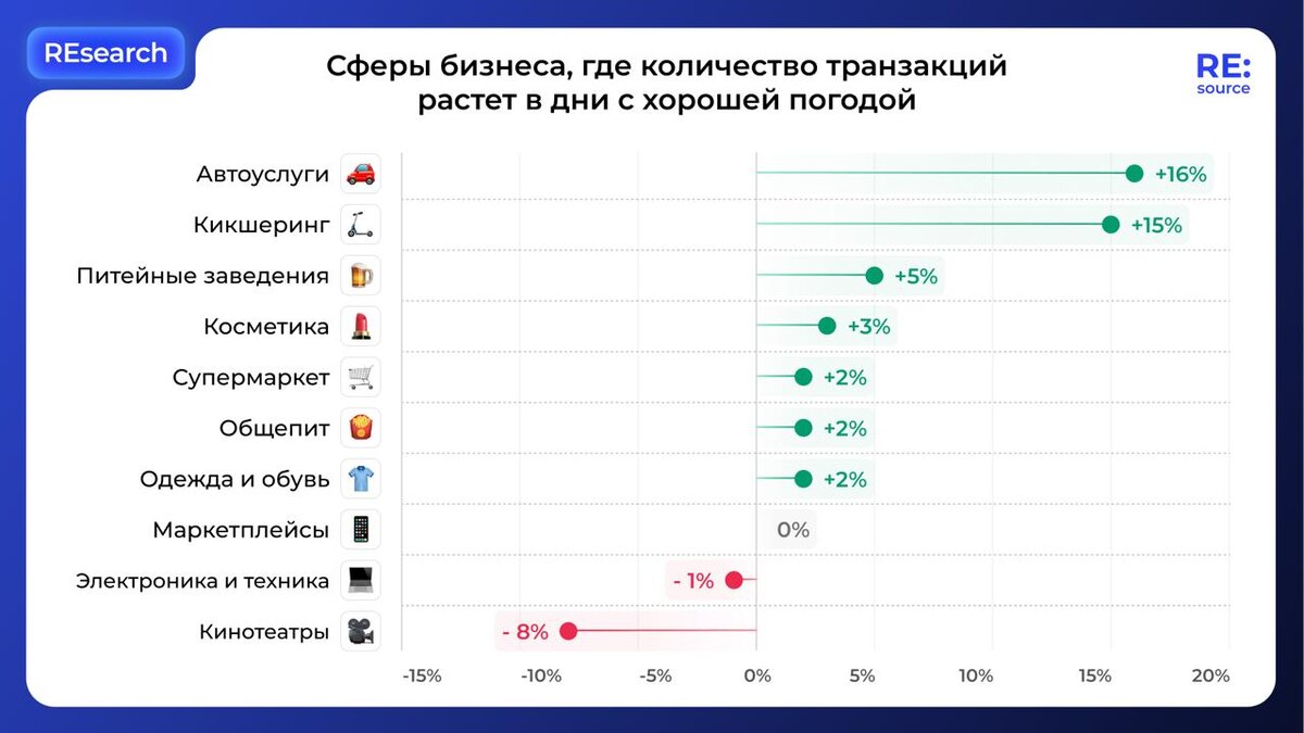 🔹🔹🔹 Кинотеатры теряют 8% транзакций в дни с хорошей погодой Такие показатели получили аналитики T-Data и Центрального университета в ходе совместного исследования влияния непогоды на траты жителей Москвы. 🍿Кинотеатры стали той редкой категорией, которой плохая погода играет на руку. А в солнечные дни наоборот наблюдается снижение количества транзакций: летом на 8%, зимой на 9%. 🚗Самой восприимчивой к изменениям погоды оказалась сфера автоуслуг — в солнечные летние дни количество транзакций увеличивается на 22%, а в дождь или снег — снижается. 🛴Успехом также пользуется и аренда электросамокатов — кикшеринг. В хорошую погоду самокатами пользуются чаще и дольше, поэтому средний чек увеличивается на 3%, а количество транзакций — на 15%. Источник: T-Data, Центральный университет (рус) #REsearch Подписаться на RE:source