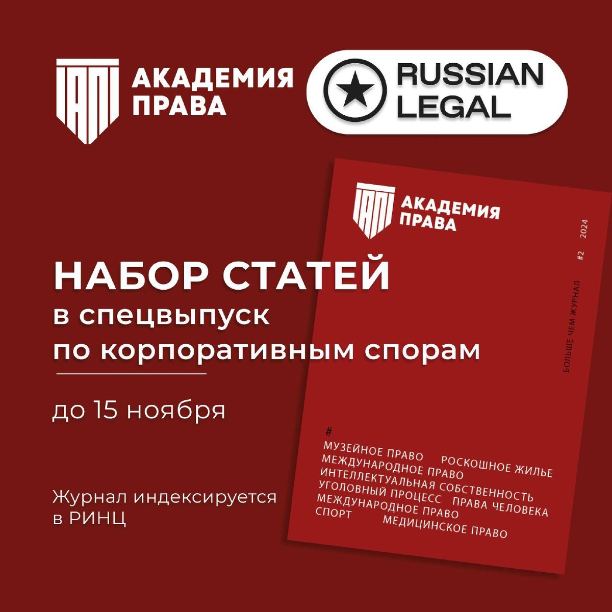 Журнал «Академия права» совместно с Адвокатским бюро RussianLegal объявляет о наборе статей в спецвыпуск, посвященный одному из самых сложных и востребованных направлений — корпоративным спорам RussianLegal — Адвокатское бюро, специализирующееся на разрешении масштабных и комплексных корпоративных конфликтов. Эксперты бюро выступят кураторами и экспертами проекта. Что мы ждем? • Статьи от студентов, магистрантов, аспирантов, преподавателей и практикующих юристов по актуальным вопросам корпоративных споров. • Темы: споры между совладельцами бизнеса, конфликты между акционерами и менеджментом, семейно-наследственные споры в отношении долей / акций и другие актуальные юридические аспекты корпоративных конфликтов. • Объем: от 15 до 25 страниц. • Главное условие: работа должна быть оригинальной и ранее нигде не опубликованной. Сроки и отбор: • 📅 Прием материалов до 15 ноября • В спецвыпуск войдут 10-15 лучших публикаций, отобранных экспертами RussianLegal, редакцией журнала, а также при