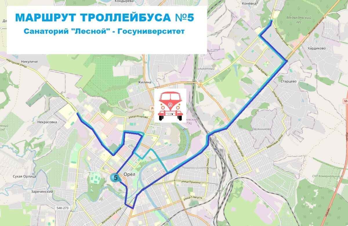 В Орле троллейбусный маршрут №5 вновь изменил маршрут. Такая информация появилась в сообществе «Общественный транспорт Орла онлайн». После завершения ремонта на улице 60-летия Октября, троллейбусы №5 вернулись на Октябрьский мост и улицу Герцена, но только в одном направлении. Теперь от конечной "Санаторий "Лесной" троллейбусы №5 едут по через Московское шоссе, Московскую улицу, улицу Герцена, Октябрьский мост, улицу 60-летия Октября, улицу 8-го Марта, Красноармейскую, Октябрьскую улицу, а также больницу "Семашко" и далее по Наугорскому шоссе до конечной "Госуниверситет". От конечной "Госуниверситет" троллейбусы №5 теперь едут через больницу "Семашко" и улицу Приборостроительную, а далее, после сквера Гуртьева, следуют по улице Октябрьской через Атолл, улицу Тургенева, Тургеневский мост, улицу 1-ю Посадскую, площадь Карла Маркса, Красный мост, гостиницу Орёл и далее по Московской улице и Московскому шоссе до конечной "Санаторий "Лесной". Ранее гендиректор МУП "ТТП" Игорь Косолапов за